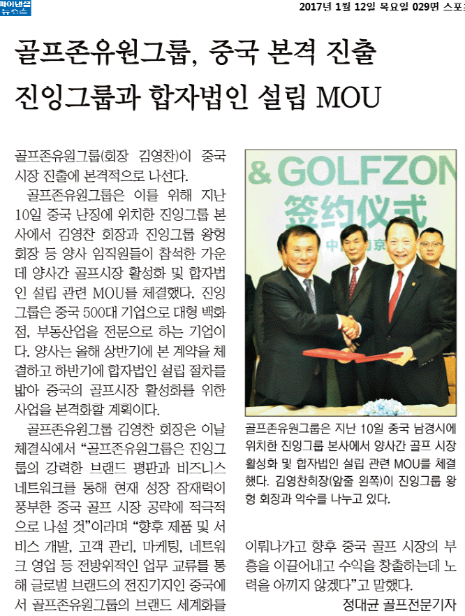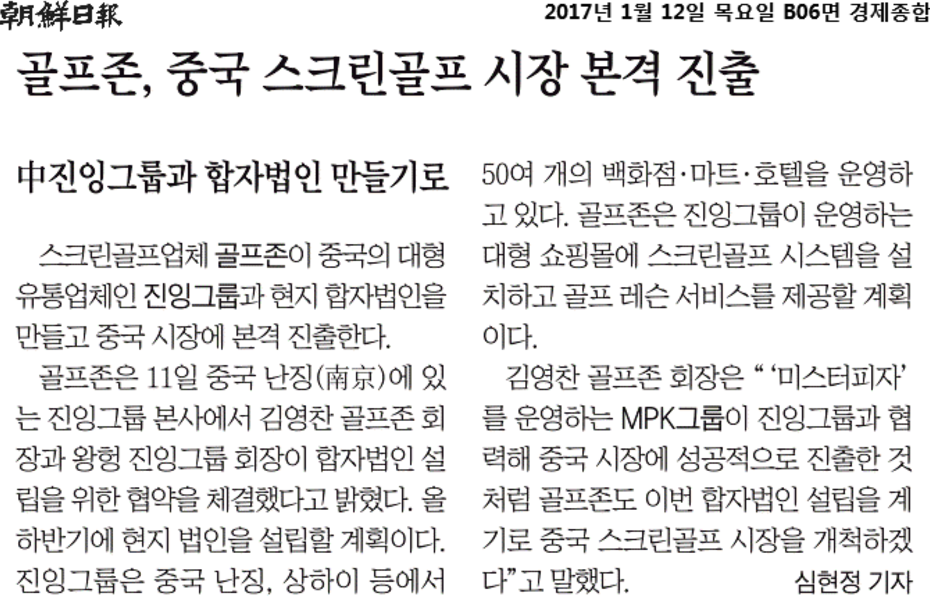 | 중도일보 | 골프존, 中진잉그룹과 협약 | ||||||