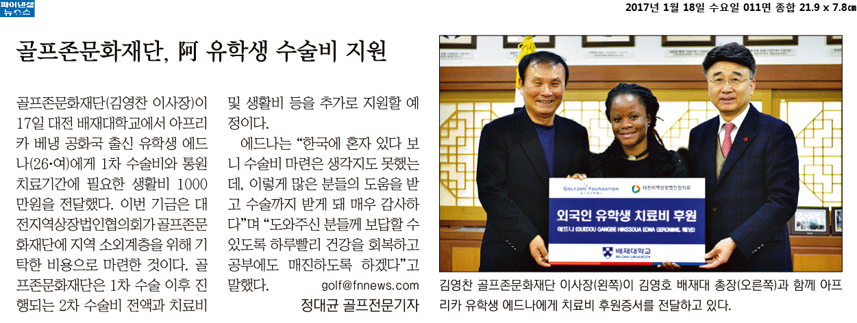 | 충청투데이 | 골프존, 아프리카 유학생 치료비 후원 | ||