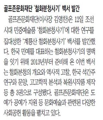 골프존문화재단에서 2013년부터 후원하며 진행해온 “철화분청사기 백서”가 어제 발간되어 동아일보, 연합뉴스 등 주요 언론사와