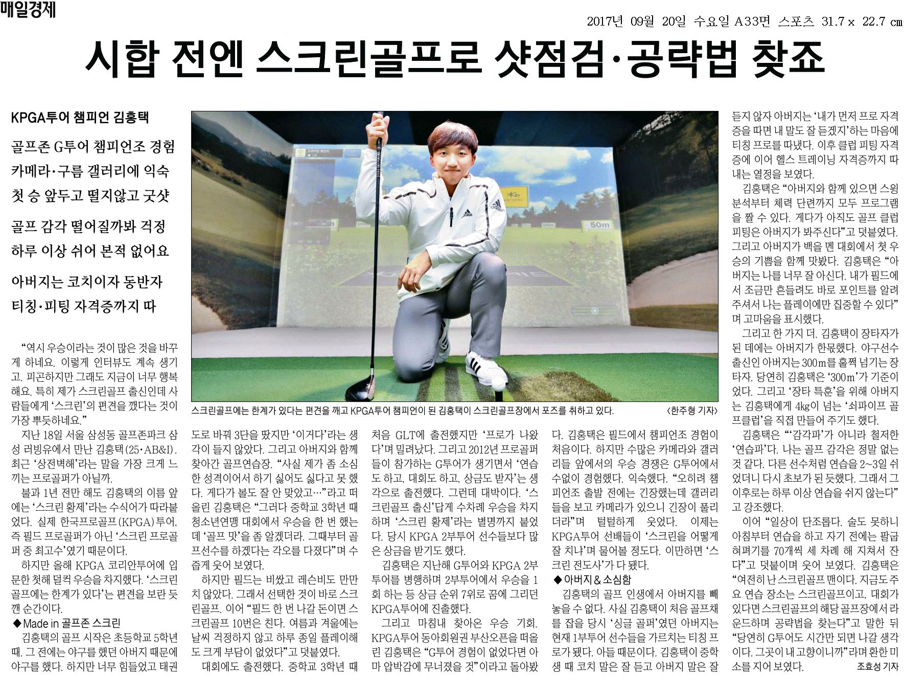 [9월 20일 골프존뉴딘그룹 News]매일경제 김홍택 프로 인터뷰 ‘시합 전엔 스크린골프로 샷 점검·공략법 찾죠’