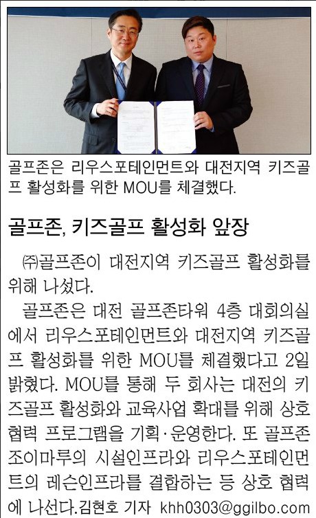 | 6 | 중도일보 | ㈜골프존·리우스포테인먼트 ‘키즈골프 활성화’ 맞손 | 온라인 | |