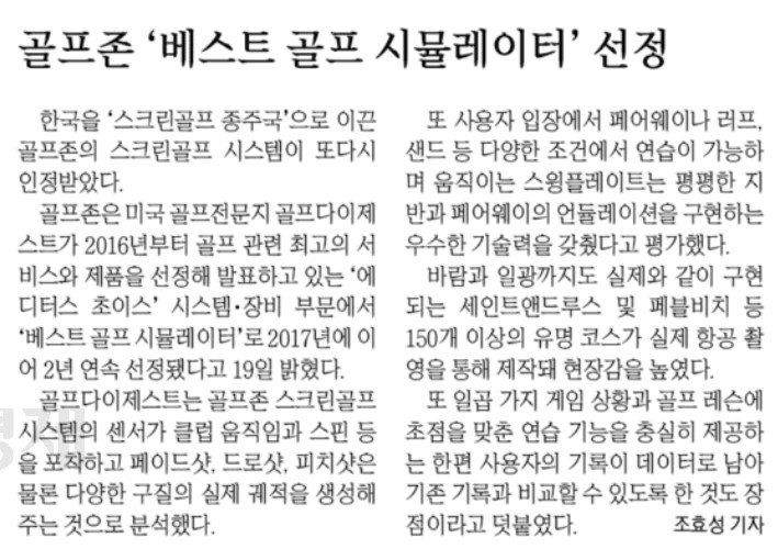 | 14 | 중소기업신문 | 골프존, 美 골프다이제스트 ‘베스트 골프 시뮬레이터’ 선정 | 온라인 | |