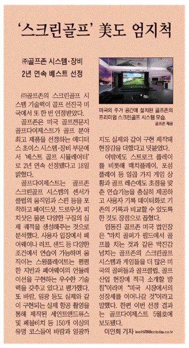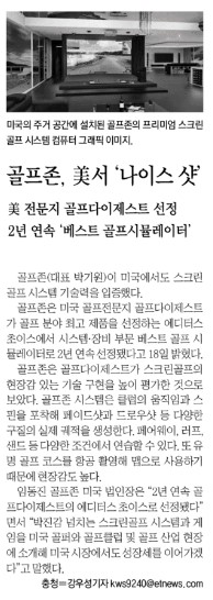 | 3 | 전자신문 | 스크린골프 미국에서도 통했다…골프다이제스트, 베스트 시뮬레이터로 2년 연… | 지면/온라인 | |