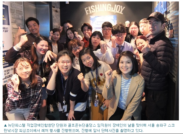 (서울=국제뉴스) 김성민 기자 = 골프존뉴딘그룹 계열사 ㈜뉴딘파스텔이 지난 19일 서울 송파구에 위치한 (주)뉴딘플렉스 ‘피싱조이’에서 장애인과 비장애인 직원이 함께 하는 피싱조이 레저 행사를 열고 직원 간 뜻 깊은 화합의 장을 마련했다. 장애에 대한 편견을 없애고 직장 동료로서 이해의 폭을 넓히자는 취지로 진행된 이 날 행사에는 ㈜뉴딘파스텔의 직업장애인 합창단 단원들과 ㈜골프존뉴딘홀딩스 임직원 등 20여명이 참석했다. ㈜골프존뉴딘홀딩스 임직원들은 낚시방법이 낯선 합창단원들을 위해 캐스팅하는 법을 비롯한 낚시 방법 등을 알려주며 직원 간 소통을 강화하고, 친목을 도모하는 즐거운 시간을 만끽했다. 골프존뉴딘홀딩스 CSR 담당 정은진 과장은 “장애인의 날을 맞이해 장애인과 비장애인 직원의 구분 없이 하나가 되는 화합의 시간을 가지게 되어 뜻 깊게 생각한다”며 “향후에도 뉴딘파스텔과 골프존뉴딘그룹 임직원이 함께 하는 기회를 지속적으로 마련해 장애에 대한 편견을 없애고, 임직원이 서로 소통하는 기업문화를 만들어갈 계획이다”라고 말했다. 이날 행사를 주최한 ㈜뉴딘파스텔은 음악을 통해 소외계층의 일자리를 창출하고 문화예술 발전에 기여하기 위해 설립된 회사로, 현재 지적·지체·정신 장애인 11인(여성 5인, 남성 6인)으로 구성된 ‘뉴딘파스텔 직업장애인 합창단’을 운영하고 있다. 지난달에는 음악단체 운영 사업장으로는 국내 최초로 장애인표준사업장으로 인정받은 바 있다. 한편, 골프존뉴딘그룹은 전 그룹사 차원에서도 장애인을 대상으로 한 다양한 사회공헌활동을 이어 오고 있다. 대표적으로 ‘골프친구’와 ‘VR스포츠체험 지원’, ‘IT/GOLF/CULTURE 봉사단’ 등이 있다. 2014년부터 매주 진행되어 온 ‘골프친구’는 골프존 임직원들의 재능기부 활동으로 발달장애인 골퍼들에게 ‘골프친구’가 되어주는 행사다. ‘VR스포츠체험 지원 자원봉사’는 모든 임직원이 골프를 칠 줄 안다는 기업의 장점을 살려 임직원들이 지역아동센터 아동과 1대 1로 월 2~3회 지속적인 소통을 이어간다. 올해 창설된 3개의 ‘IT/GOLF/CULTURE 봉사단’은 컴퓨터, 골프, 문화예술 등 각 분야의 재능을 가진 임직원들이 복지관을 방문해 발달장애인들에게 자신의 재능을 나눈다. |