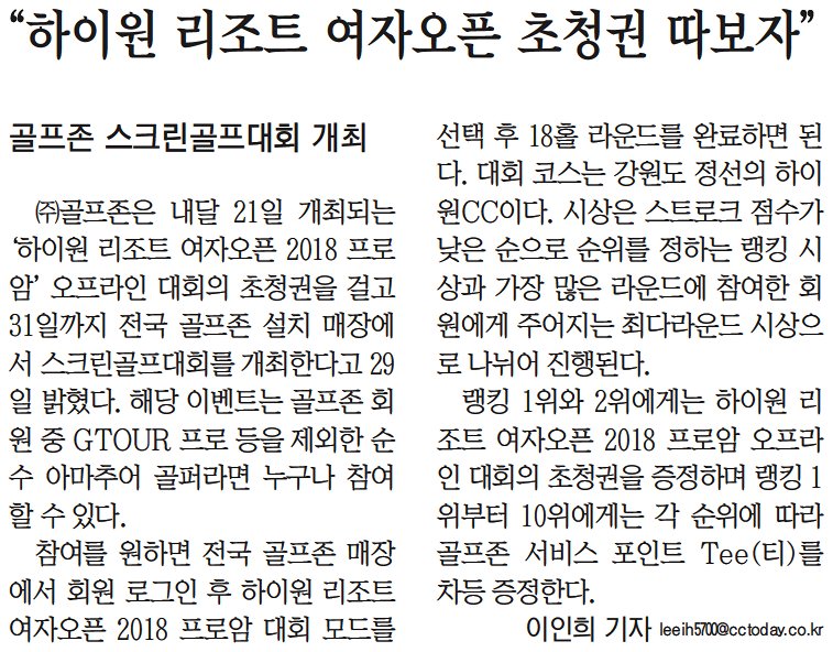 | 13 | 중소기업신문 | 골프존, ‘하이원 리조트 여자오픈 2018 프로암’ 초청권 이벤트 | 온라인 |