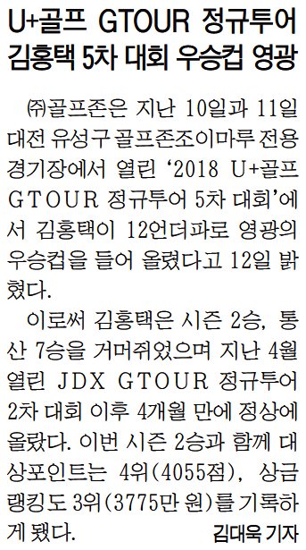 | 9 | 금강일보 | 김홍택, ‘2018 U+골프 GTOUR 정규투어 5차 대회’ 우승 | 온라인 |