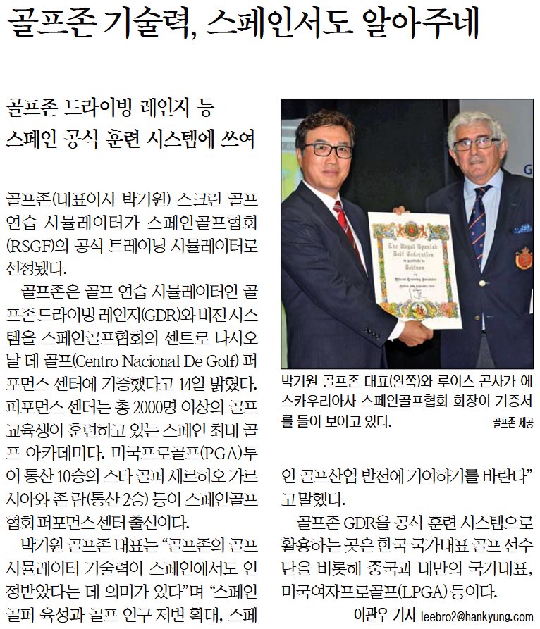 <한국경제_골프존, 스페인골프협회 공식 트레이닝 시뮬레이터로 선정>