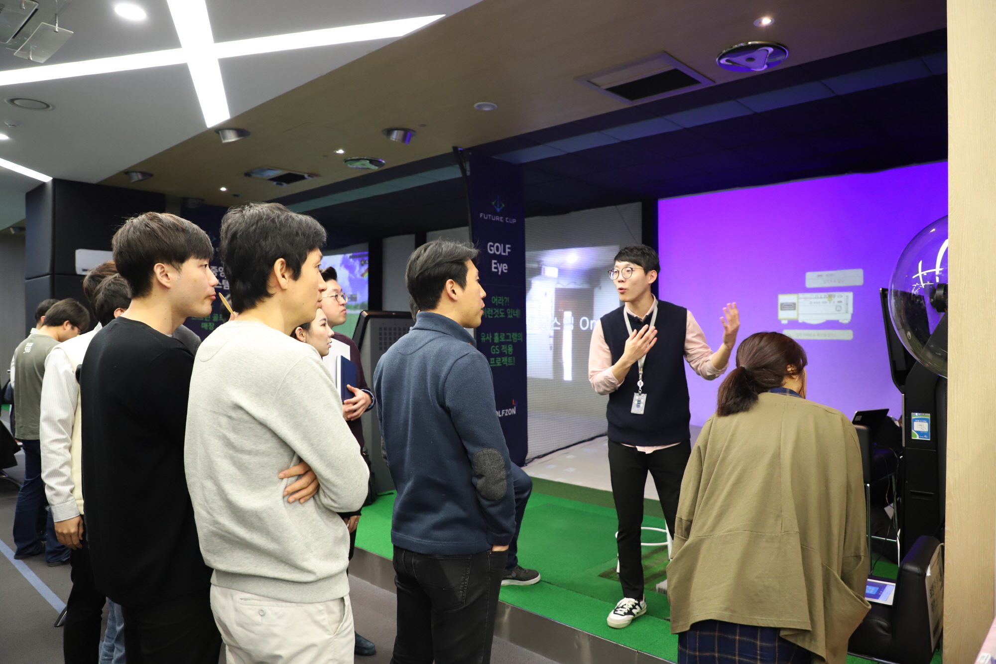 사진2. 골프존은 지난 15일과 16일 차세대 성장동력 기술 발굴 및 연구원들의 연구개발 의욕을 고취하기 위해 ‘골프존 2018 퓨처컵‘을 개최했다. 사진은 별도 시연 부스에서 프로젝트 성과물을 체험하고 있는 골프존 임직원.