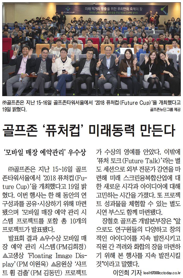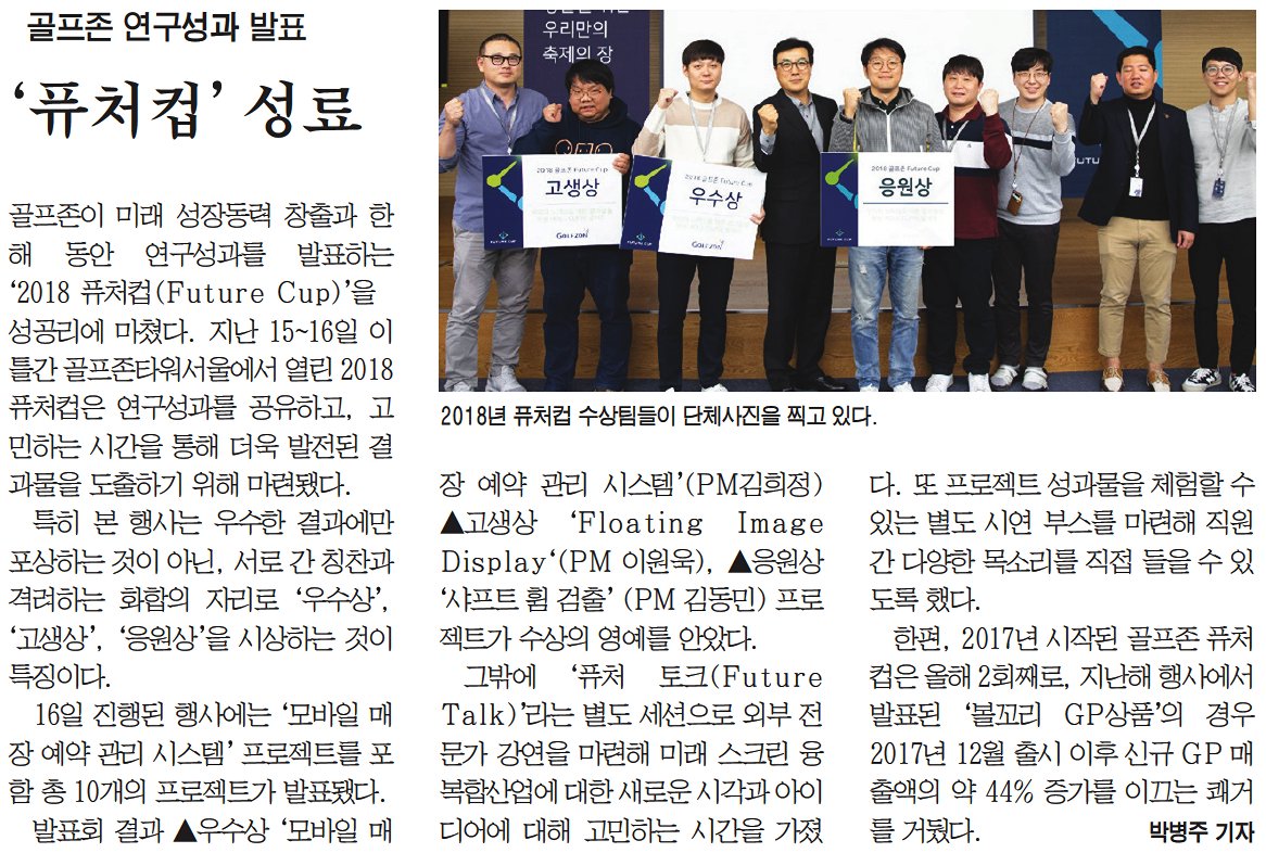 골프존, 미래 성장동력 창출 위한 축제의 장…‘2018 퓨처컵’ 개최 – 지난 15일과 16일 서울 강남구 위치한 골프존타워서울에서 한 해 동안의 연구성과 발표회인 ‘2018 퓨처컵‘ 개최 – 미래 성장동력 창출 및 선도 기술 확보…연구원들의 창의적인 아이디어 제안 분위기 조성 목적 – 한 해 동안 아이디어 개발 위해 고생한 직원 간 쌍방향 커뮤니케이션 통해 응원과 격려의 ‘화합의 장‘ 마련