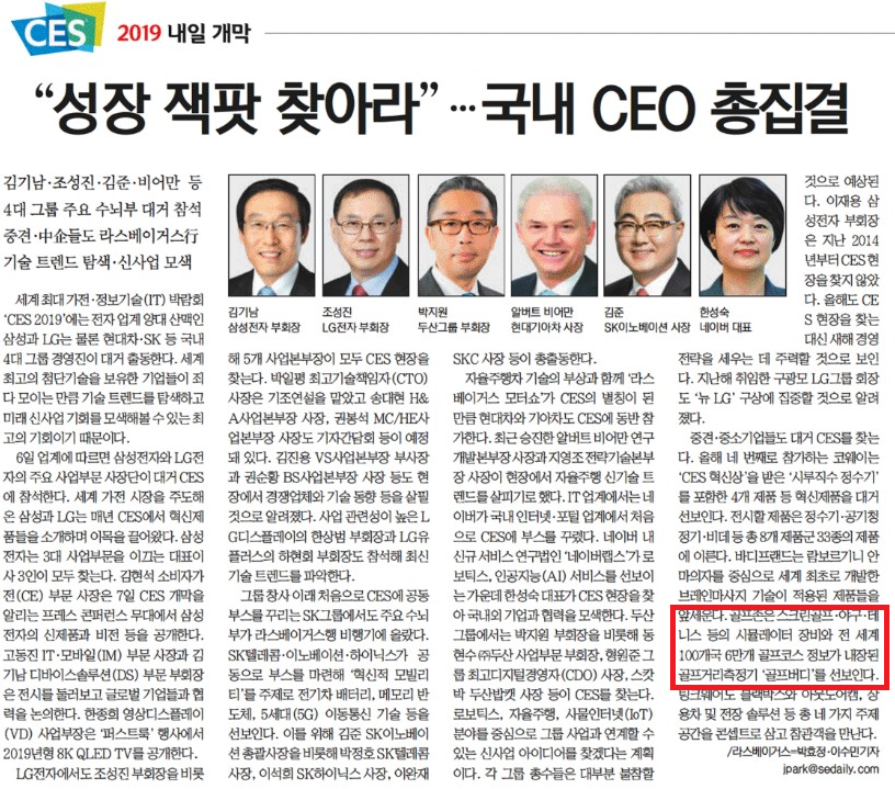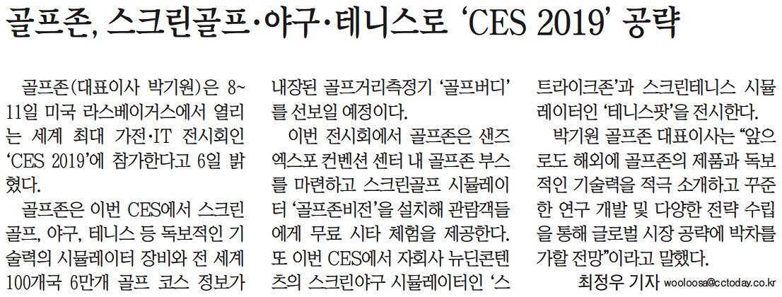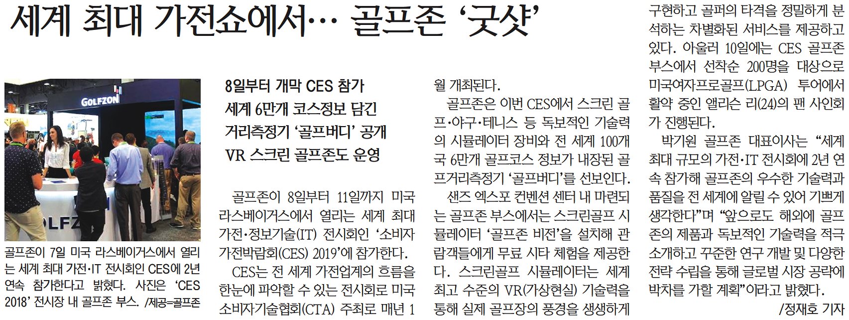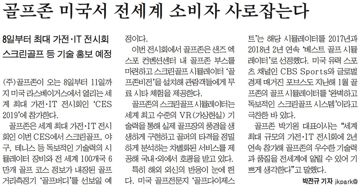 | 7 | 파이낸셜뉴스 | 골프존, 세계 최대 IT전시회 CES 2019 참가 | 온라인 | |