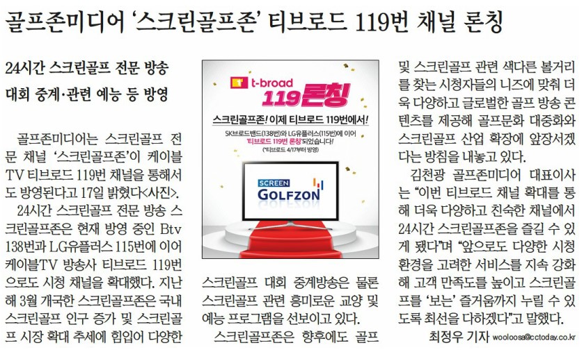 [4월18일 골프존뉴딘그룹News]골프존미디어‘스크린골프존’티브로드 119번채널론칭