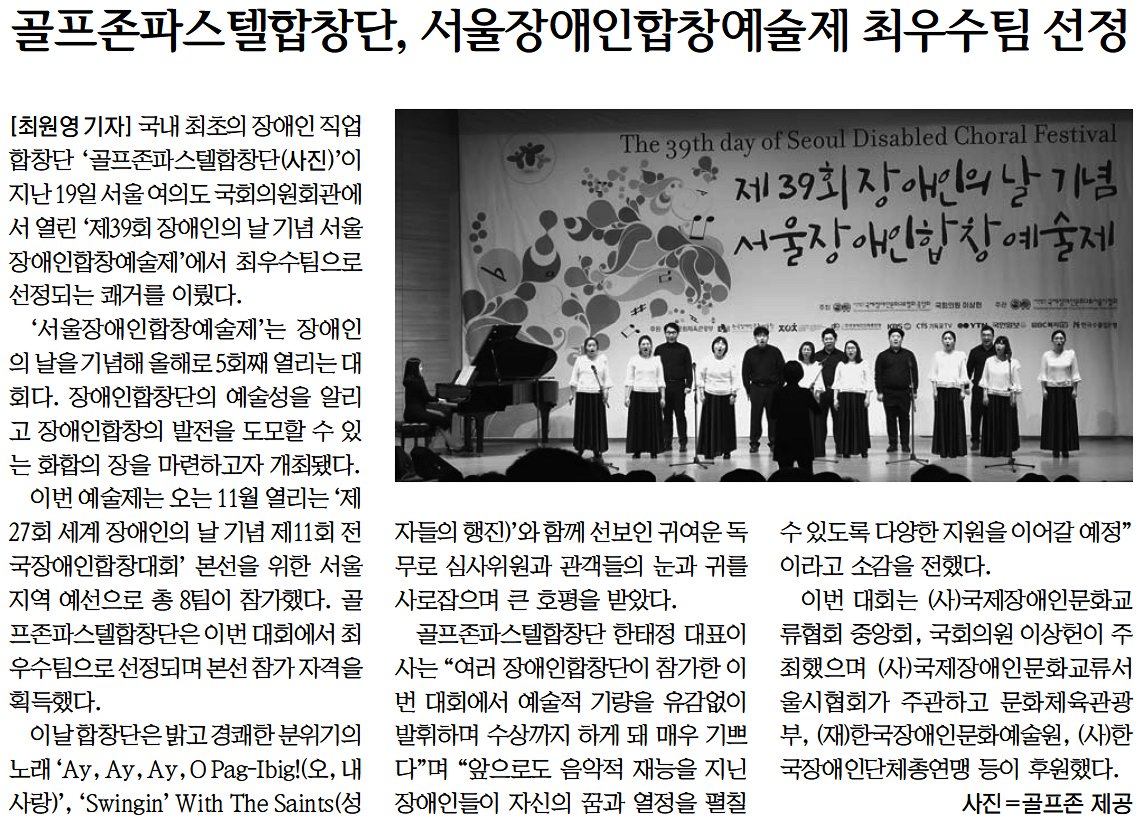 국내 최초의 장애인 직업합창단 골프존파스텔합창단이 ‘제39회 장애인의 날 기념 서울장애인합창예술제’에서 최우수팀으로 선정됐다.