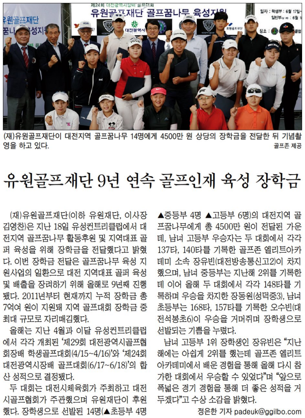 [6월20일 골프존뉴딘그룹News]유원골프재단, ‘대전지역 골프꿈나무 장학금’ 전달 언론 보도 | 2019.06.20 No매체명제목게재형태비고1YTN[대전/대덕] 유원골프재단, 골프 꿈나무 14명에게 장학금영상/온라인2금강일보(재)유원골프재단, 9년 연속 ‘대전지역 골프꿈나무 장학금’ 전달지면/온라인제18면3대전일보[사진뉴스] 유원골프재단, 지역 골프인재 육성 장학금지면/온라인제20면4중도일보유원골프재단, 대전지역 골프 인재 육성 위한 장학금 전달 지면/온라인제20면5충청투데이대전 골프 꿈나무들 향한 ‘사랑의 나이스샷’지면/온라인제20면6뉴스1유원골프재단, 대전 골프꿈나무 14명에 장학금 4500만원 전달 온라인7헤럴드경제유원골프재단, 대전 골프꿈나무에 장학금 9년째 전달 온라인8골프가이드유원골프재단, 9년 연속 대전 지역 골프 인재 육성 위한 장학금 전달온라인9뉴스다이제스트(재)유원골프재단, 대전 지역 골프 인재 육성을 위한 장학금 전달…총 장학금 4,500만 원온라인10뉴스인사이드(재)유원골프재단, 9년 연속 대전 지역 골프 인재 육성 위한 장학금 전달온라인11매일일보유원골프재단, 대전 지역 골프 인재 육성 위한 장학금 전달온라인12브레이크뉴스유원골프재단, 대전 골프꿈나무 장학금 9년 연속 전달온라인13사건의내막(재)유원골프재단, 9년연속 대전지역 골프인재 육성위한 장학금 전달온라인14스포탈코리아유원골프재단, 9년 연속 대전 지역 골프 인재 육성 장학금 전달 온라인15시사매거진(재)유원골프재단, 9년 연속 대전 지역 골프 인재 육성 위한 장학금 전달온라인16SR타임스[SR사회공헌] 유원골프재단, 9년연속 대전 지역 골프 인재 육성 장학금 전달 온라인17OSEN유원골프재단, 9년 연속 대전 지역 골프 인재 육성 장학금 전달 온라인18이뉴스투데이유원골프재단, 9년 연속 ‘대전 지역 골프 인재 육성 장학금’ 전달온라인19이지경제[사회공헌] 골프존 유원골프재단, 대전 지역 골프 인재 육성 위한 장학금 전달온라인20이코노미타임즈(재)유원골프재단, 대전 지역 골프 인재 육성을 위한 장학금 전달…지역 골프대회 장학금 중…온라인21조세일보유원골프재단, 대전 골프꿈나무에 장학금 4500만원 전달온라인22웰빙뉴스(재)유원골프재단, 9년연속 대전 지역 골프 인재 육성 위한 장학금 전달온라인23팩트뉴스(재)유원골프재단, 대전 지역에 장학금 전달…골프 인재 육성 도모온라인24프레스맨유원골프재단, 9년 연속 대전 지역 골프 인재 육성 위한 장학금 전달온라인25스포츠서울유원골프재단 대전지역 초중고 장학생 14명에 4500만원 전달온라인26스포츠월드(재)유원골프재단, 9년 연속 대전 지역 골프 인재 육성 위한 장학금 전달온라인27충청뉴스(재)유원골프재단, 9년 연속’ 대전 지역 골프 인재 육성’ 장학금 전달온라인28토요경제유원골프재단, 9년 연속 대전 지역 골프 인재 육성 위한 장학금 전달온라인 [2019.06.19 금강일보 제18면] 본문 텍스트 복사하기 본문 이미지 전체 다운로드 연관 콘텐츠 언론 보도 [04월21일]골프존, 아파트 커뮤니티 전용 스크린골프 렌탈 서비스 론칭 2026.04.21 언론 보도 [04월17일]골프존파스텔합창단, 장애인 합창단원 모집 “함께 부르는 희망의 하모니” 2026.04.17 언론 보도 [04월15일]골프존커머스, 26년 3월 골프클럽 판매 순위 공개 2026.04.15 언론 보도 김영찬 회장, 4년 연속 ‘Golf Inc’ 선정 아시아 골프산업에서 가장 영향력 있는 인물 1위 선정 2026.04.14 언론 보도 [04월10일]골프존문화재단, 제13회 대전 그리다, 꿈꾸다 展’ 개최 2026.04.10 언론 보도 [03월31일]골프존문화재단, 1천800만원 상당 ‘이웃사랑 행복나눔’ 생필품 후원 2026.03.31