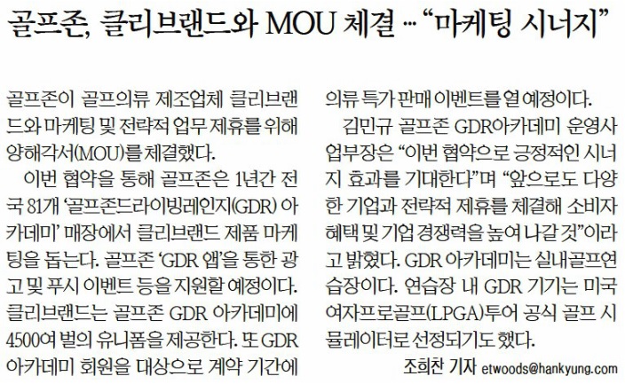 골프존, 클리브랜드와 MOU 체결…”마케팅 시너지 기대“ -2/27 GDR아카데미 하남 스타필드점에서 ‘골프존 GDR아카데미 &클리브랜드 업무 협약식‘ 개최 –골프존, 전국 81개 GDR아카데미 매장 통해 클리브랜드 홍보 등 브랜드 마케팅 지원 –클리브랜드, GDR아카데미에 유니폼 4500벌 제공 및 고객 특가 이벤트 등 양사 마케팅 시너지 창출 기대