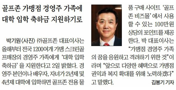 골프존이 올해부터 골프존파크 경영주 가족의 ‘대학 입학 축하금’을 지원하며 가맹점과의 상생협력을 강화할 전망입니다. 골프존은 이외에도 지난 1월부터