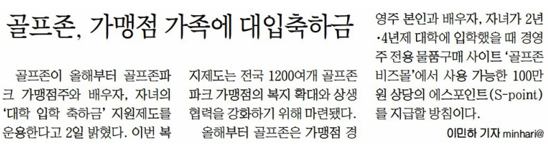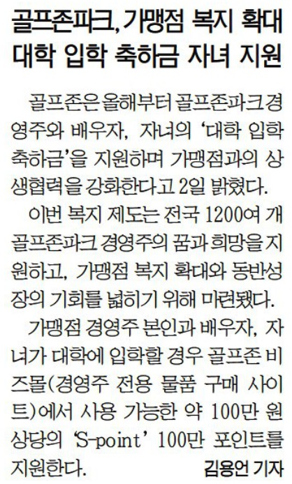 | 골프존, 1200여개 골프존파크 경영주 가족 대학 입학 축하금 지원 – 가맹점 경영주·배우자·자녀의 신규 대학 입학 시 골프존 비즈몰에서 사용 가능한 S-point 100만 포인트 지원 –지난 1월부터 가맹점 및 비가맹점 대상 상조 서비스 지원하는 등 다양한 복지 확대 위해 노력