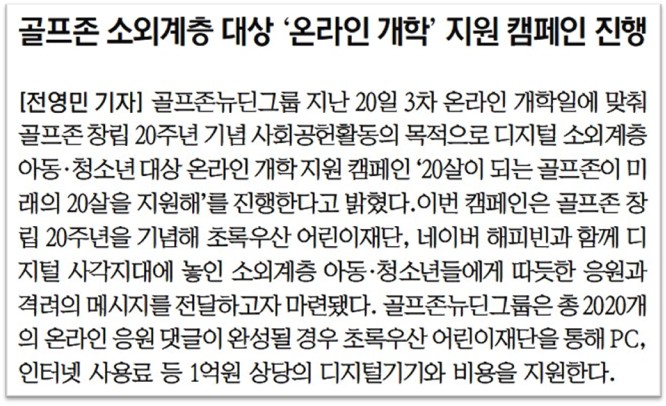 [4월 21일 골프존뉴딘그룹 News]골프존뉴딘그룹,온라인개학 맞이한 디지털소외계층 1억 지원!