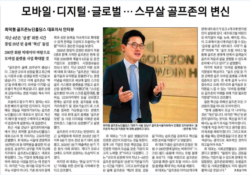 [6월 4일 골프존뉴딘그룹News]골프존뉴딘홀딩스 최덕형 대표님 인터뷰, ‘모바일,디지털,글로벌…스무살 골프존의 변신’