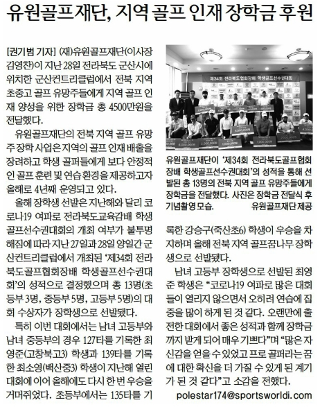 1 스포츠월드 유원골프재단, 4년 연속 전북 지역 골프 인재 양성을 위해 장학금 후원 지면/온라인 제13면