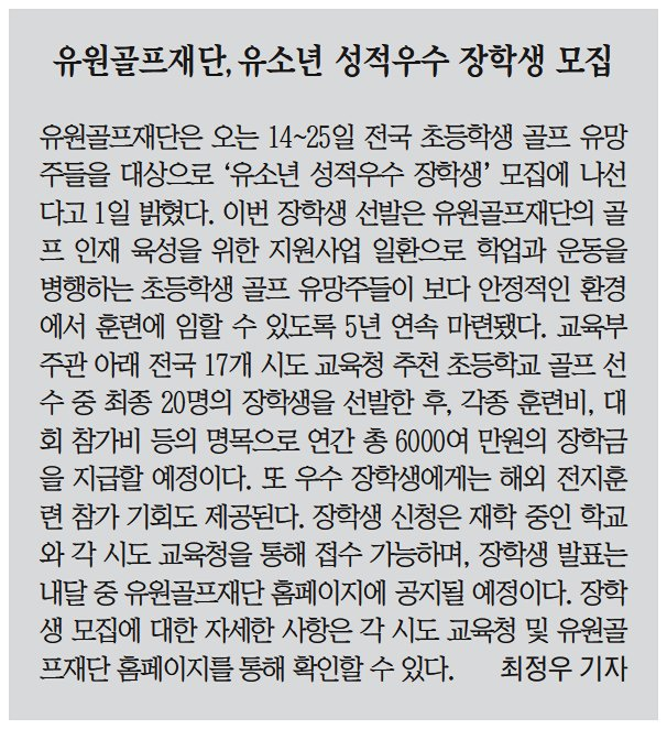 8매일일보유원골프재단, 골프 인재 육성 위한 ‘유소년 장학생’ 모집온라인