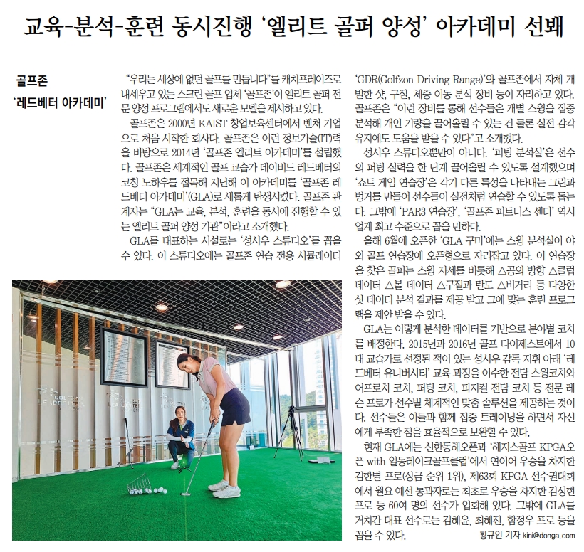 KPGA를 싹쓰리하는 김한별, 김성현 선수등 스타를 배출해내고 있는 골프훈련소 ‘골프존 레드베터아카데미(GLA)’ 기획자료가 아래와 같이 보도되었습니다. 교육, 분석,