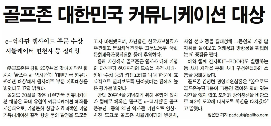골프존이 창립 20주년을 맞아 제작한 웹사사 ‘골프존 e-역사관’이 ‘대한민국 커뮤니케이션 대상’에서 웹사이트 부문 기획대상을 수상했습니다.