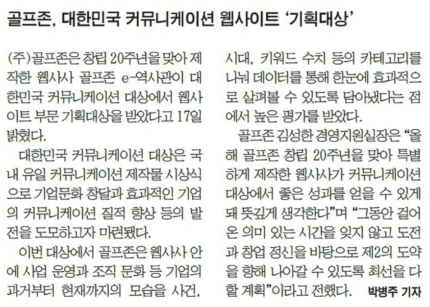 15비즈니스워치골프존 e-역사관, 웹사이트 부문 기획대상 수상온라인