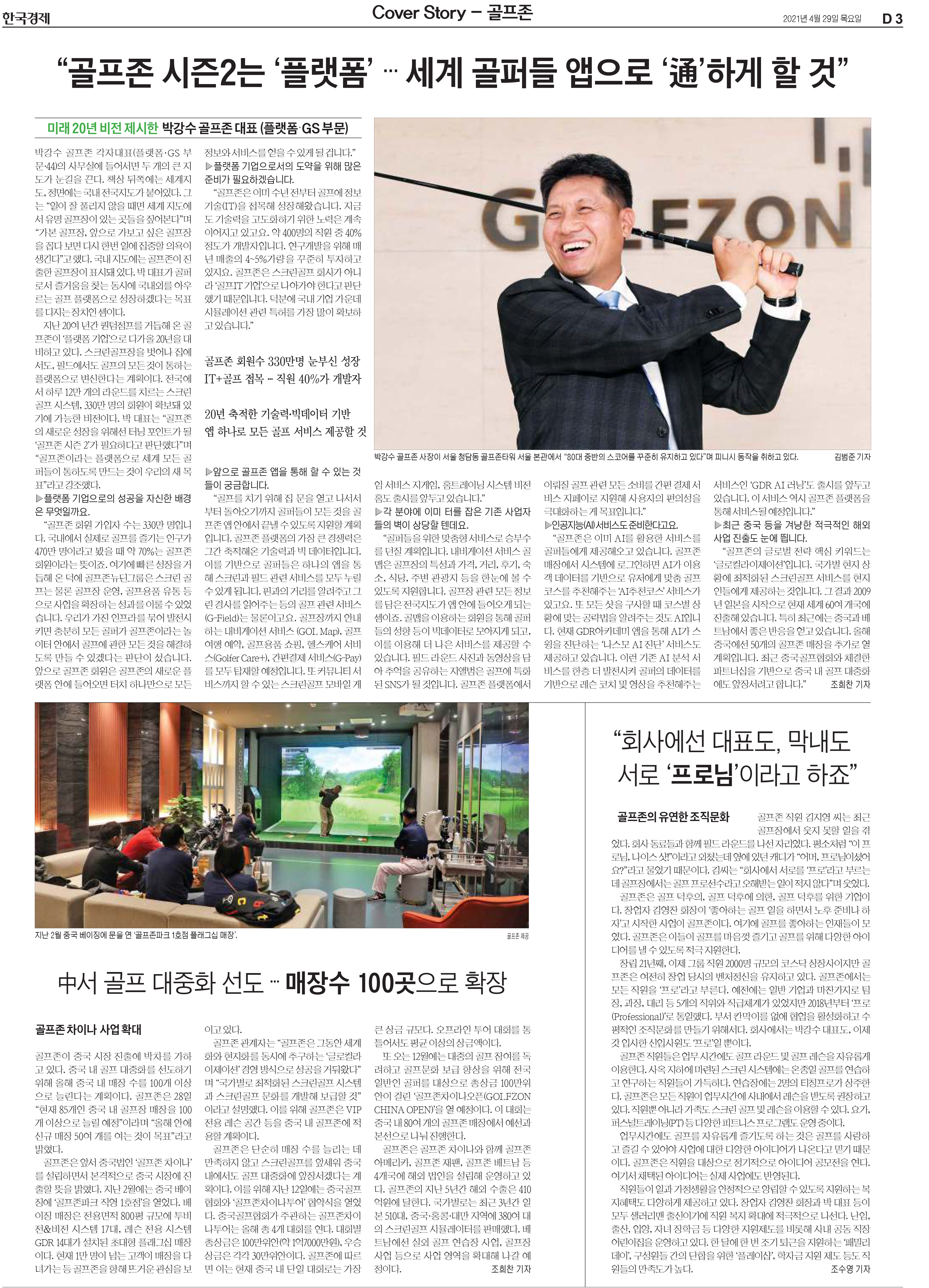 | 4 | 한국경제 | “골프존 시즌2는 ‘플랫폼’…세계 골퍼들 앱으로 ‘通’하게 할 것” | 지면/온라인 | 제D03면 |