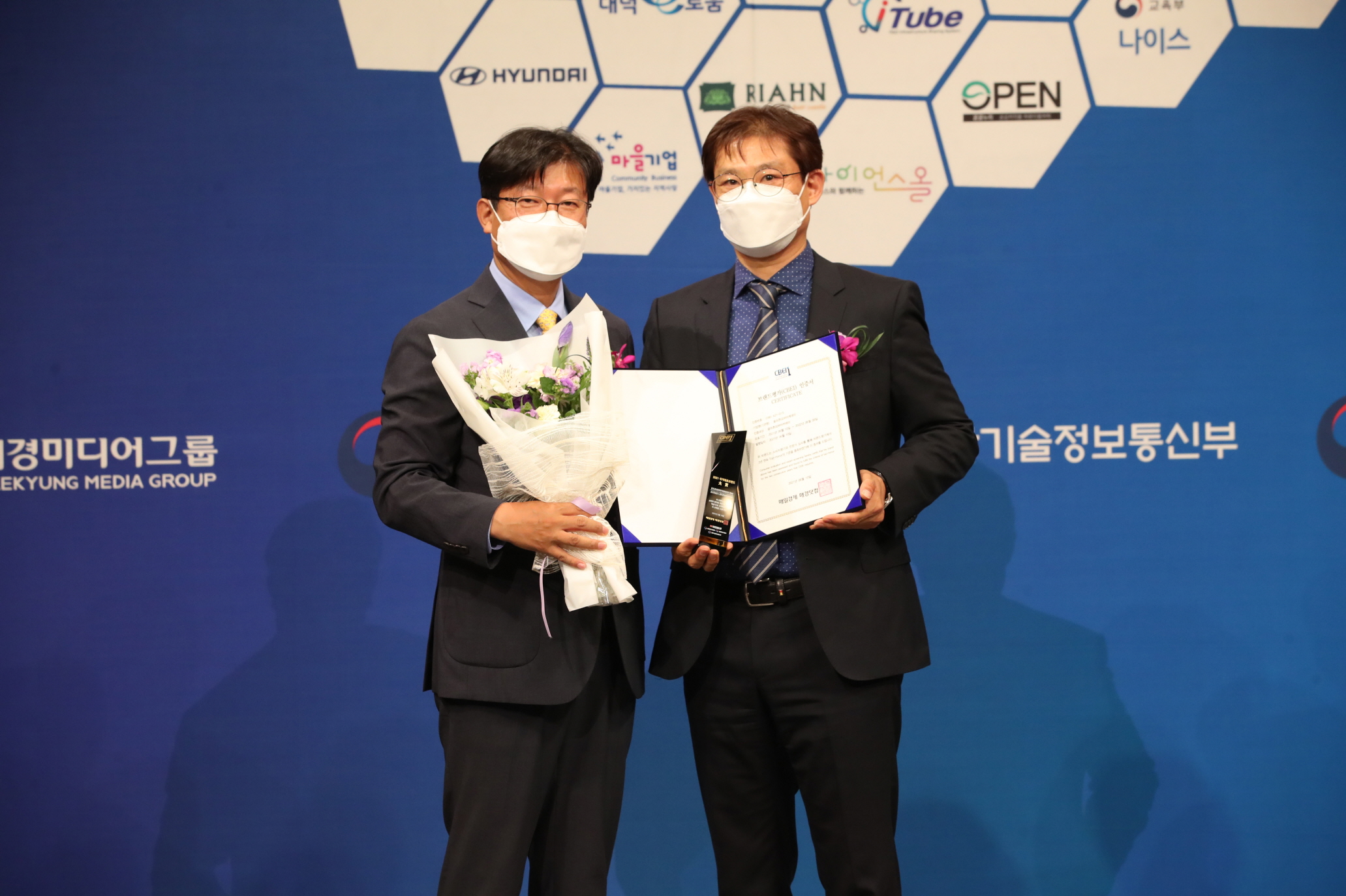 사진1. 6 10() 밀레니엄 힐튼 서울호텔에서 열린 ‘2021 국가대표 브랜드 대상 시상식’에서 (왼쪽부터) 매경비즈 장종회 대표이사, 골프존 GDR 사업기획실 안웅기 상무가 기념사진을 촬영하고 있다.