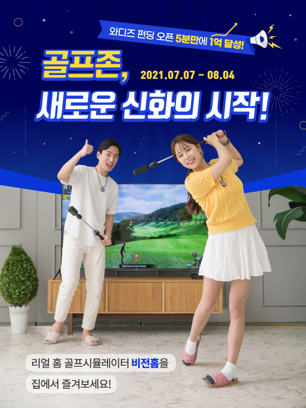 골프존, 가정용 골프 시뮬레이터 신제품 ‘비전홈‘ 와디즈 펀딩 오픈 하루 만에 사전 배송 물량 완판 – 7/7(수)~8/4(수), 골프존의 20년간의 노하우가 담긴 가정용 골프 시뮬레이터 신제품 ‘비전홈’ 크라우드 펀딩 진행 – 펀딩 시작 하루 만에 사전 배송 물량 완판…오픈 5분 만에 매출 1억원 기록, 현재 기준 펀딩 목표치 21,000% 이상 초과 달성 – 자이로 센서, 임팩트볼, 에이밍 레이저 등을 통해 실감 나는 골프 라운드 환경 제공