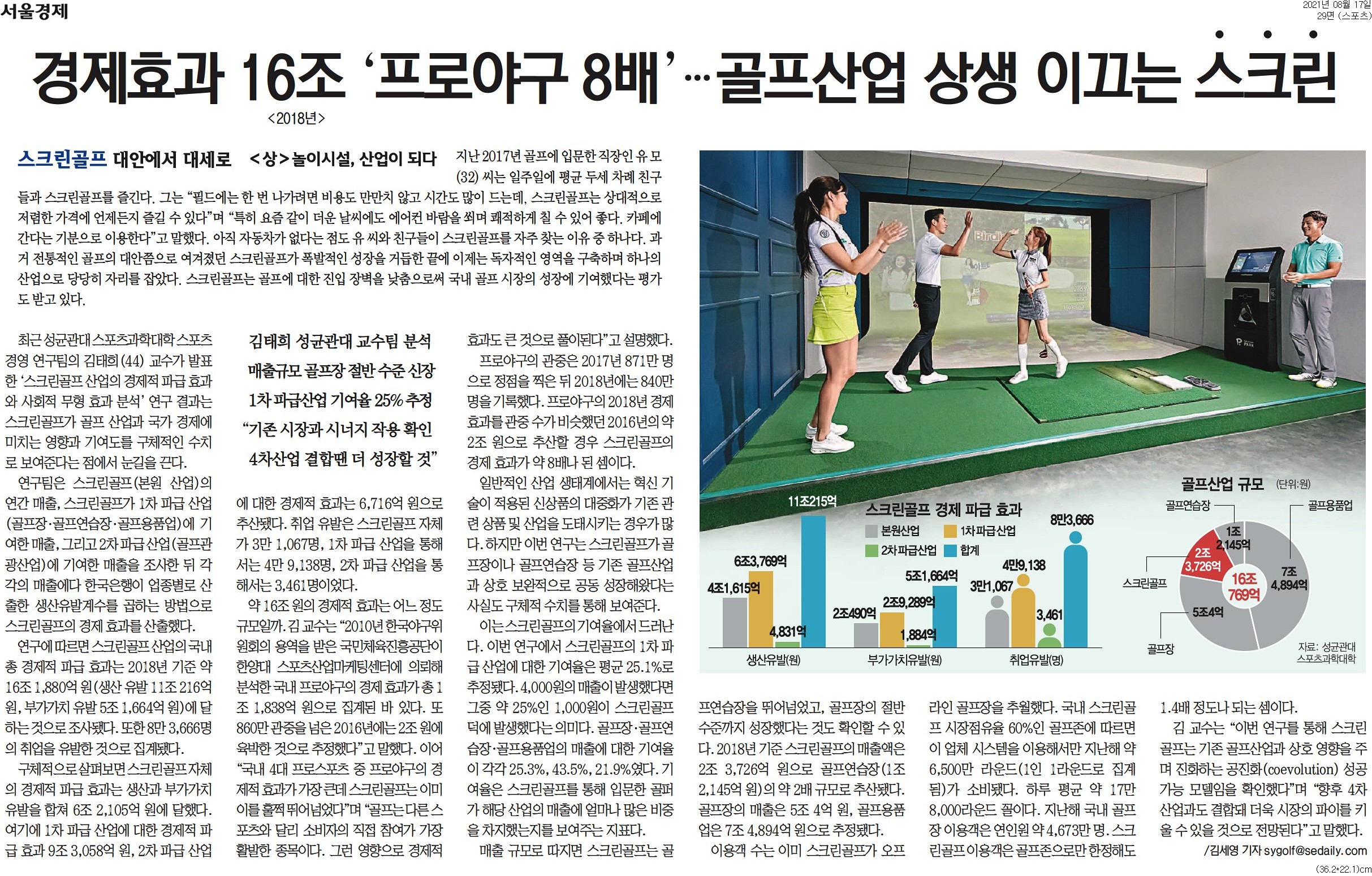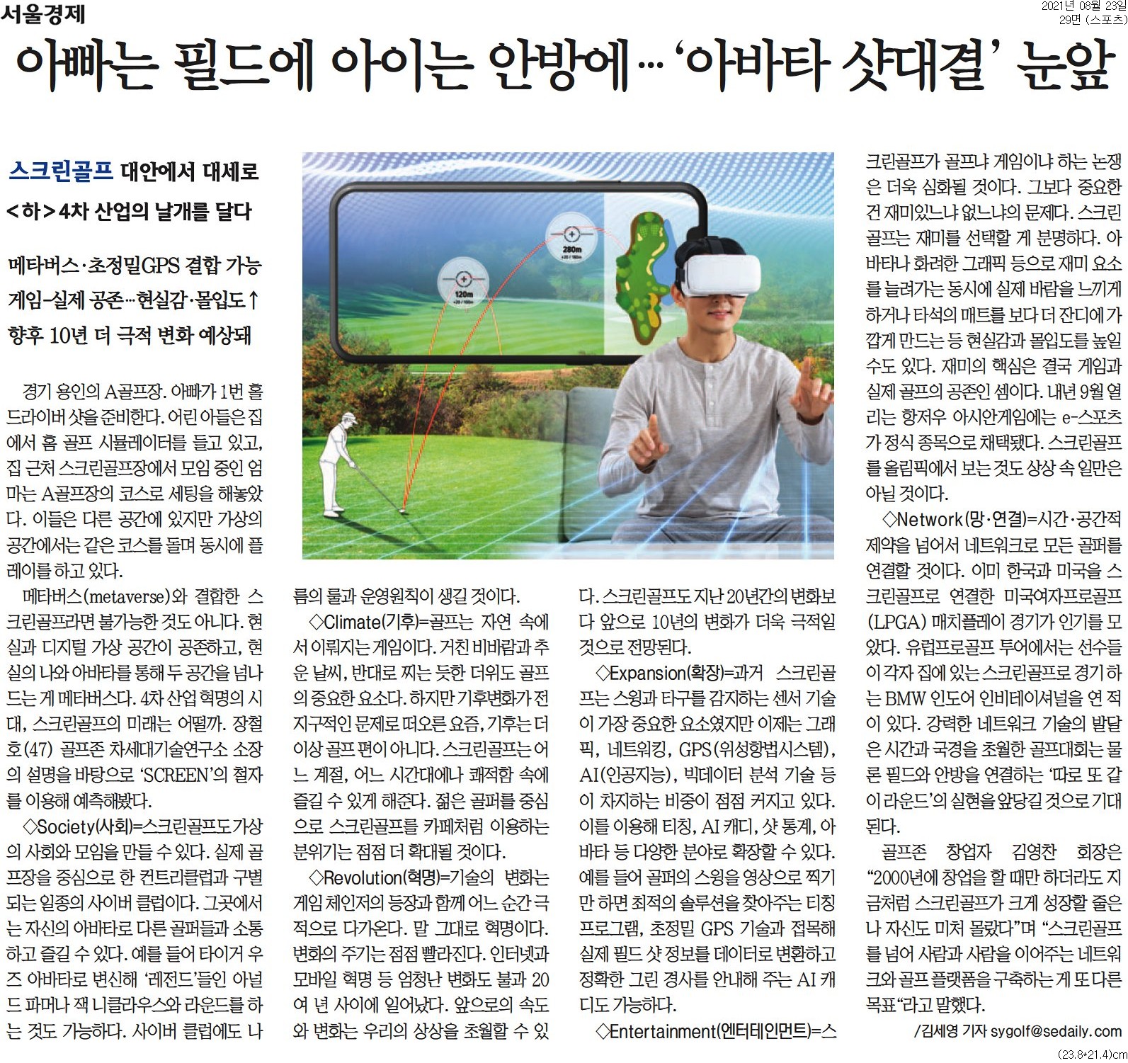 표현하기 위해 서울경제신문과 함께 ‘스크린골프 대안에서 대세로’ 시리즈를 기획하였습니다. 관련하여 <상> ‘놀이시설, 산업이 되다’ , <중> ‘ 고루한 골프를 바꾸다’
