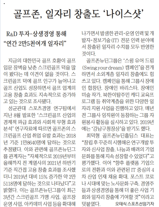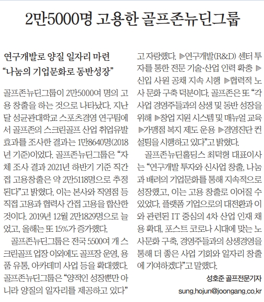 골프존뉴딘그룹이 상생경영을 통해 총 2만5천 여개의 일자리를 창출했다는 기사가 동아일보, 중앙일보 등 주요 매체에 보도 되었습니다.