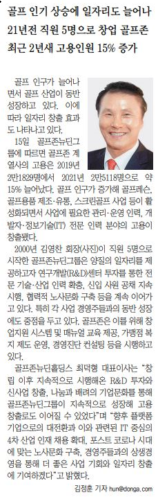 골프인기상승에일자리도늘어나… 21년전직원 5명으로창업골프존, 최근 2년새고용인원 15% 증가