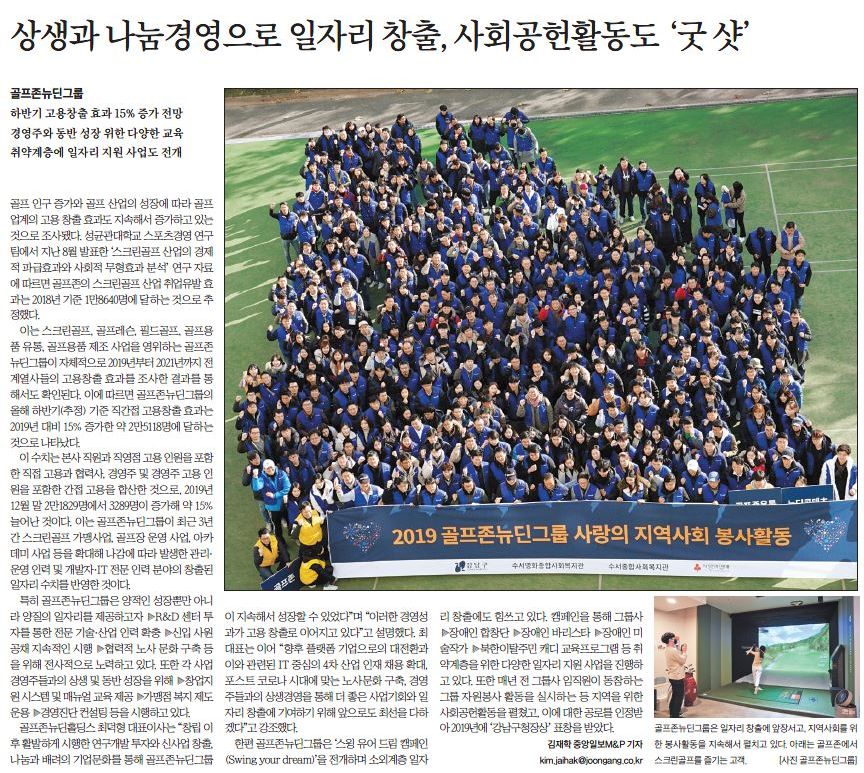 [9월23일 골프존뉴딘그룹News]상생과 나눔경영으로 일자리 창출, 사회공헌활동도 굿샷! (중앙일보)