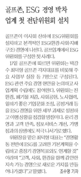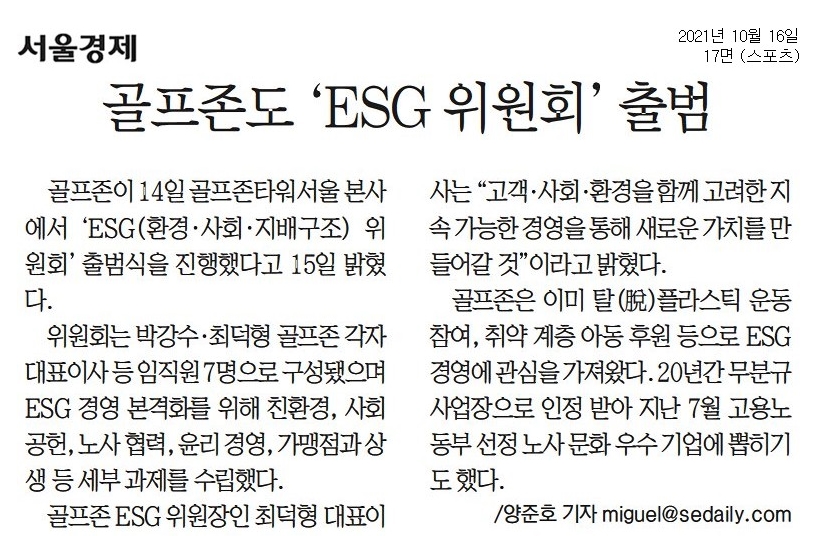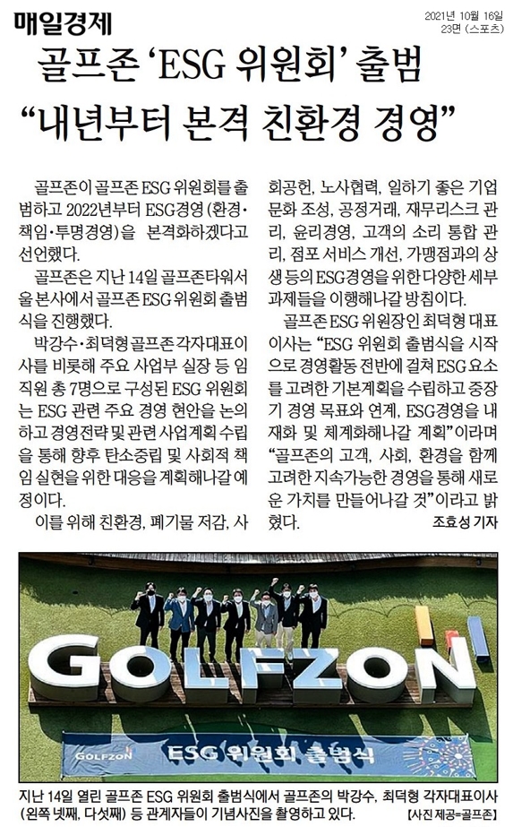 [10월14일 골프존뉴딘그룹News]골프존, ESG 위원회 출범…ESG 경영 본격화 나서(매일경제 외 44건)