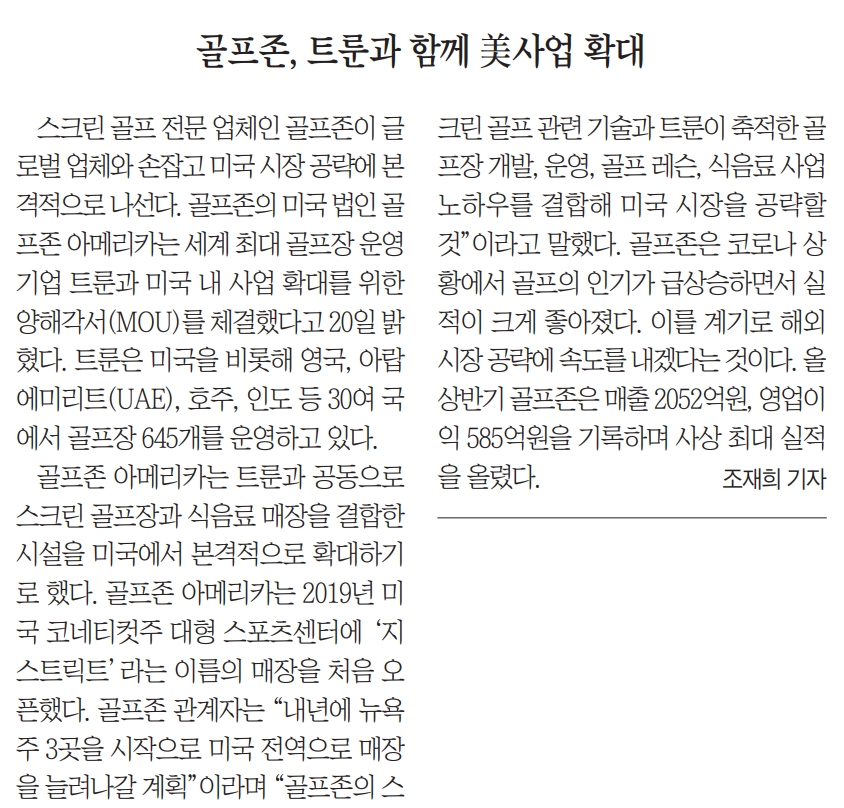 1조선일보골프존, 트룬과 함께 美사업 확대지면/온라인제B04면