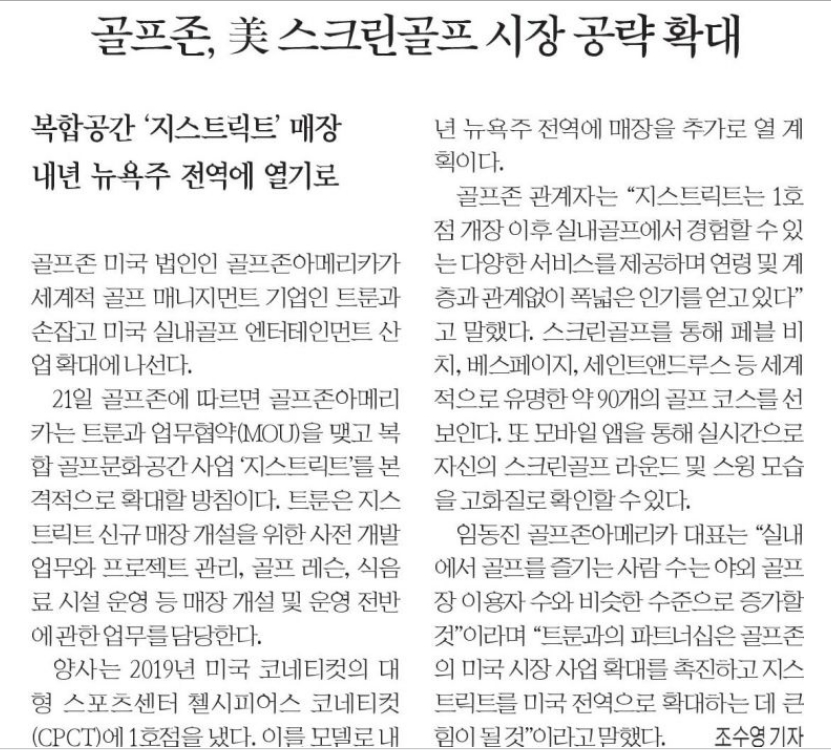 12서울신문골프존, 미국 시장 공략 박차.. 글로벌 매니지먼트 트룬과 파트너십온라인