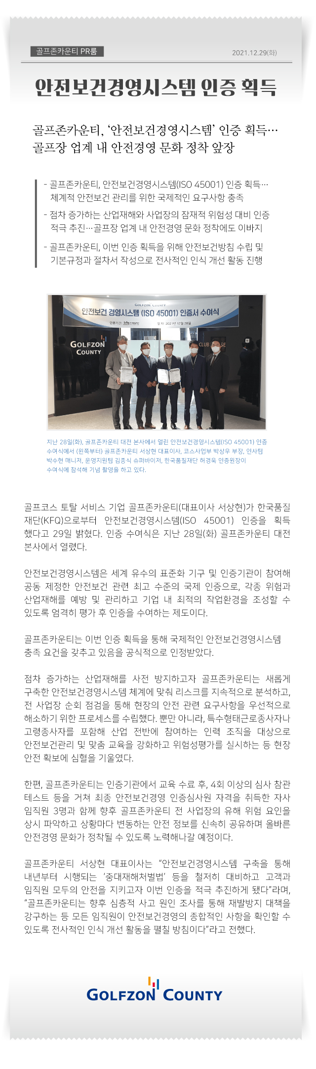 [01월10일]골프존카운티, 안전보건경영시스템(ISO 45001) 인증 획득