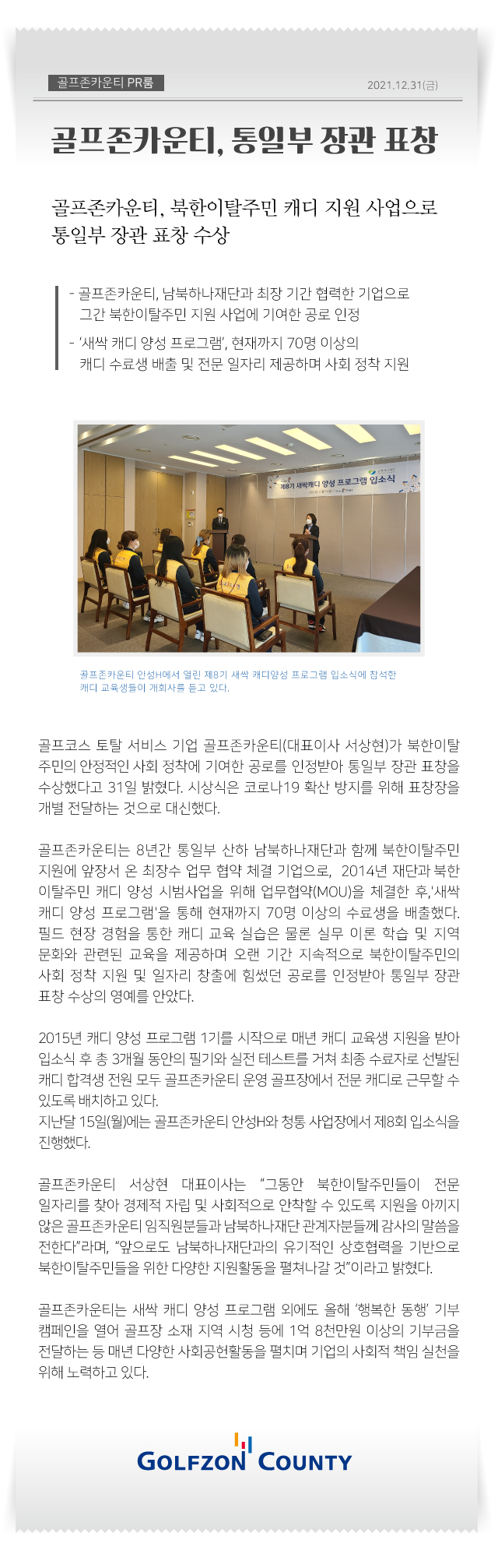 | 12 | 이코노미타임즈 | 골프존카운티, 북한이탈주민 캐디 지원 사업으로 통일부 장관 표창 수상 | 온라인 |