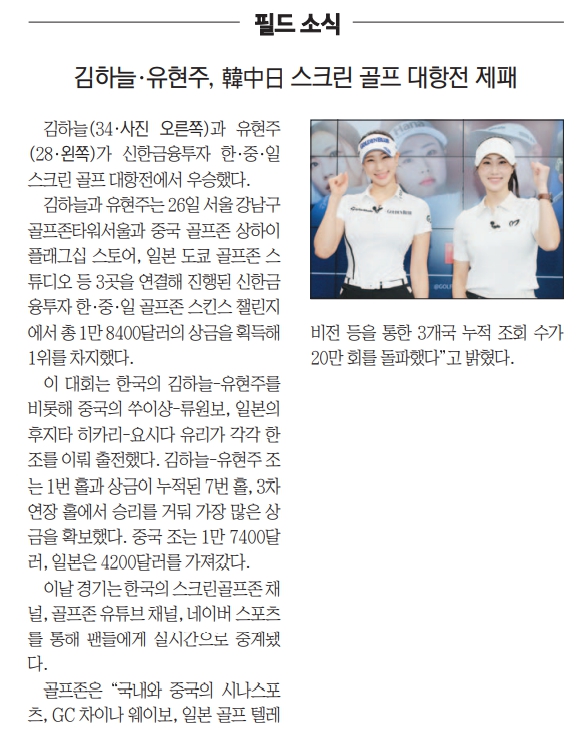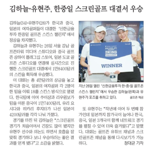 ‘신한금융투자 한–중–일 골프존 스킨스 챌린지‘ 연장 접전 끝에 한국 팀 역전 우승 – 한국(김하늘&유현주) VS 중국(수이샹&리우원보) VS 일본(유리 요시다&히카리 후지타) 각국을 대표하는 여자 스타 골퍼들의 스크린골프 빅매치 – 스크린골프 종주국의 저력을 보여준 한국 팀 1만 8천4백 달러의 스킨 획득으로 중국 팀(1만 7천4백 달러 스킨), 일본 팀(4천2백 달러 스킨)과의 대결에서 우승 차지 2022.02.27