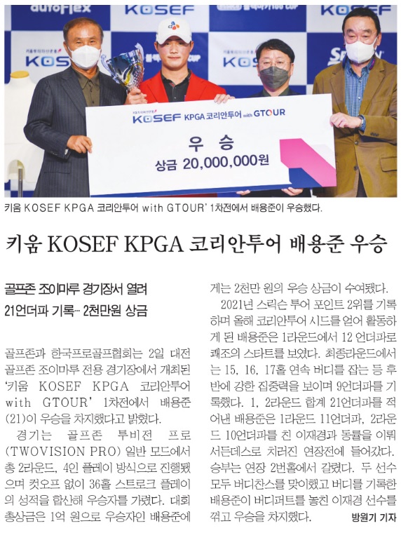 골프존 주최 ‘키움 KOSEF KPGA 코리안투어 with GTOUR’ 배용준 우승 – 4/2(토) 대전 골프존 조이마루 전용 경기장에서 ‘키움 KOSEF KPGA 코리안투어 with GTOUR’ 1차전 개최 – 배용준(21), 1, 2라운드 최종 합계 21언더파로 이재경(22)과 동타를 기록, 연장 2번째 홀에서 버디로 1차전 우승 –골프존뉴딘그룹 김영찬 회장, KPGA 구자철 회장이 함께 KPGA 발전 위해 직접 대회 참관 및 선수 시상
