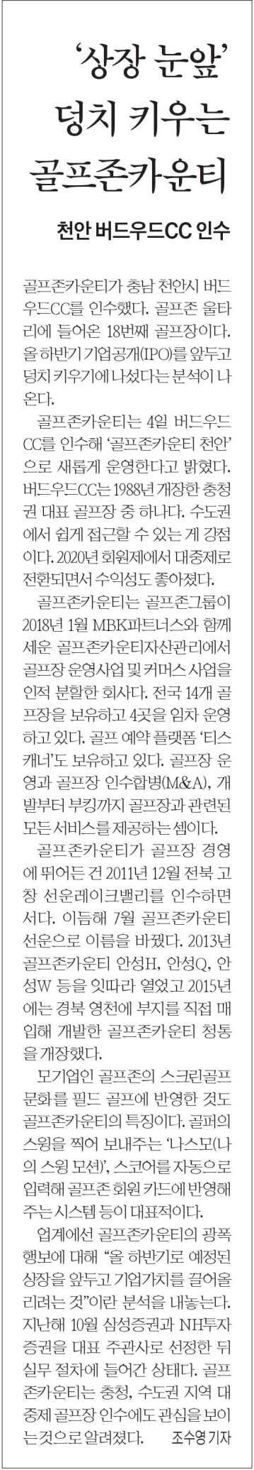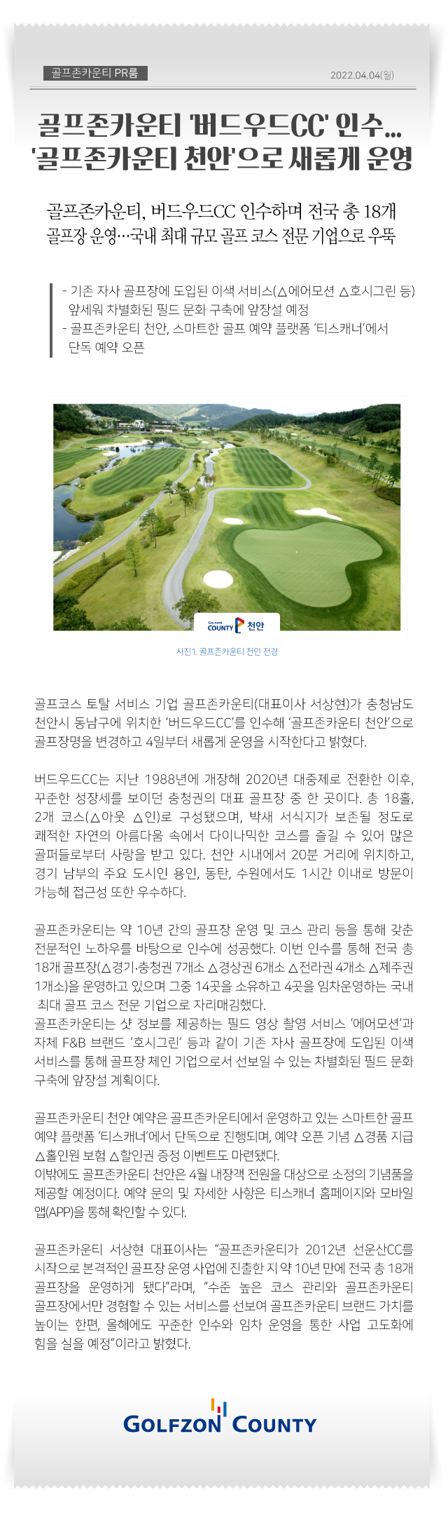 [04월04일]골프존카운티, ‘버드우드cc’인수..’골프존카운티 천안’으로 새롭게 운영 언론 보도 | 2022.04.04 No매체명제목게재형태1한국경제상장 눈앞’ 덩치 키우는 골프존카운티지면/온라인2서울경제[필드소식]골프존카운티 천안 운영 시작지면/온라인3금강일보골프존카운티, ‘골프존카운티 천안’ 신규 개장지면/온라인4중도일보천안 버드우드CC ‘골프존카운티 천안’으로 새 출발지면/온라인5SBS골프존카운티, 버드우드CC 인수로 총 18개 골프장 운영온라인6MTN골프존카운티, ‘버드우드CC’ 인수…‘골프존카운티 천안’으로 운영온라인7뉴시스골프존카운티, 천안 버드우드CC 인수…전국 18곳 운영온라인8뉴스1골프존카운티, 충청권 대표 골프장 천안 ‘버드우드CC’ 인수온라인9머니투데이골프존카운티 천안 버드우드CC 인수, 전국 18곳 운영 중온라인10조선비즈골프존카운티, 천안 버드우드CC 인수온라인11IT조선골프존카운티, 천안 버드우드CC 인수온라인12전자신문골프존카운티, 버드우드CC 인수…’골프존카운티 천안’ 새 운영온라인13뉴스다이제스트골프존카운티, ‘버드우드CC’ 인수하며 ’골프존카운티 천안’으로 새롭게 운영온라인14뉴스인사이드골프존카운티, ‘버드우드CC’ 인수 ‘골프존카운티 천안’으로 변경..전국 총 18개 골프장 운영온라인15뉴스핌버드우드CC → ‘골프존카운티 천안’으로 새 시작온라인16데이터솜골프존카운티, ‘버드우드CC’ 인수…‘골프존카운티 천안’으로 새롭게 오픈온라인17데일리한국골프존카운티, ‘버드우드CC’ 인수온라인18디트뉴스24골프존카운티, ‘버드우드CC’…’골프존카운티 천안’으로 골프장명 변경온라인19로이슈골프존카운티, ‘버드우드CC’ 인수온라인20매일일보골프존카운티, 버드우드CC 인수… 골프존카운티 천안으로 운영온라인21스포츠서울골프존카운티 ‘버드우드CC’ 인수, ‘골프존카운티 천안’으로 운영온라인22스포츠월드골프존카운티, ‘버드우드CC’ 인수…‘골프존카운티 천안’으로 새 출발온라인23시사매거진버드우드CC, ‘골프존카운티 천안’으로 골프장명 변경온라인24소셜밸류골프존카운티, ‘버드우드CC’ 인수해 ‘골프존카운티 천안’으로 변경온라인25FETV골프존카운티, ‘버드우드CC’ 인수…‘골프존카운티 천안’으로 새롭게 운영온라인26여성소비자신문골프존카운티 ‘버드우드CC’ 인수 ‘골프존카운티 천안’으로 골프장명 변경온라인27아시아에이골프존카운티, ‘버드우드CC’ 인수…’골프존카운티 천안’으로 명칭 변경온라인28일요경제골프존카운티, ‘버드우드CC’ 인수…‘골프존카운티 천안’으로 새롭게 운영온라인29이코노미타임즈골프존카운티, ‘버드우드CC’ 인수…’골프존카운티 천안’으로 새롭게 운영온라인30워크투데이골프존카운티, ‘버드우드CC’ 인수…‘골프존카운티 천안’으로 새롭게 운영온라인31증권경제신문골프존카운티, ‘버드우드CC’ 인수…‘골프존카운티 천안’으로 운영온라인32코리아데일리골프존카운티, ‘버드우드CC’ 인수…’골프존카운티 천안’으로 새롭게 운영온라인33프라임경제[골프홀릭] 캘러웨이·아디다스골프·골프존·미즈노어패럴 외온라인34핀포인트뉴스골프존카운티, 버드우드CC 인수…‘골프존카운티 천안’으로 새롭게 운영온라인35팩트뉴스골프존카운티, ‘버드우드CC’ 인수…’골프존카운티 천안’으로 골프장명 변경온라인36한국정경신문골프존카운티, 버드우드CC 인수..‘골프존카운티 천안’으로 새롭게 운영온라인37충청뉴스골프존카운티, ‘버드우드CC’ 인수…‘골프존카운티 천안’으로 새롭게 운영온라인38충청신문골프존카운티, 충남 천안 ‘버드우드CC’ 인수온라인 본문 텍스트 복사하기 본문 이미지 전체 다운로드 연관 콘텐츠 언론 보도 [04월21일]골프존, 아파트 커뮤니티 전용 스크린골프 렌탈 서비스 론칭 2026.04.21 언론 보도 [04월17일]골프존파스텔합창단, 장애인 합창단원 모집 “함께 부르는 희망의 하모니” 2026.04.17 언론 보도 [04월15일]골프존커머스, 26년 3월 골프클럽 판매 순위 공개 2026.04.15 언론 보도 김영찬 회장, 4년 연속 ‘Golf Inc’ 선정 아시아 골프산업에서 가장 영향력 있는 인물 1위 선정 2026.04.14 언론 보도 [04월10일]골프존문화재단, 제13회 대전 그리다, 꿈꾸다 展’ 개최 2026.04.10 언론 보도 [03월31일]골프존문화재단, 1천800만원 상당 ‘이웃사랑 행복나눔’ 생필품 후원 2026.03.31