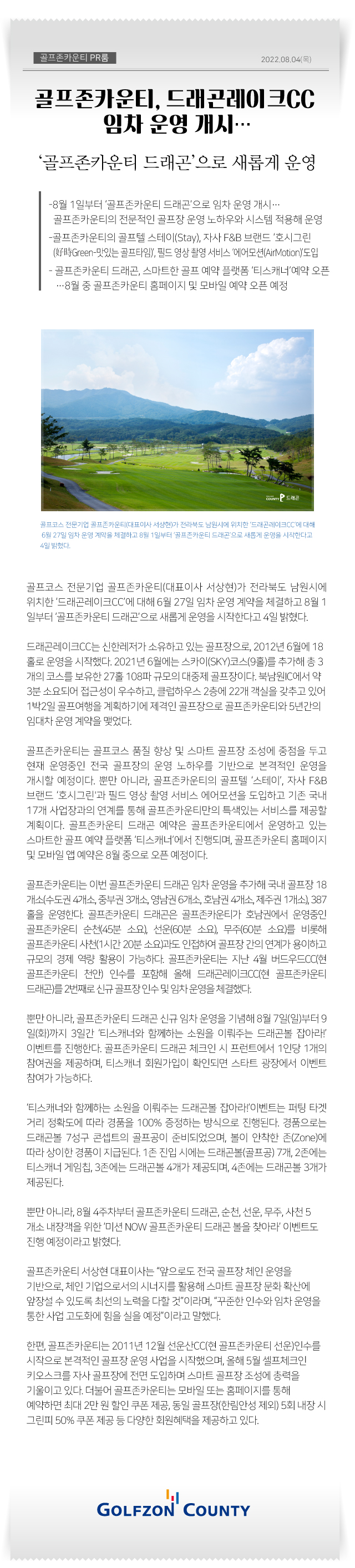 [8월4일] 골프존카운티, 드래곤레이크CC 임차운영 개시, 골프존카운티 드래곤으로 새롭게 운영 언론 보도 | 2022.08.04 No매체명제목1한국경제TV골프존카운티, 남원 `드래곤레이크CC` 5년간 임차운영 개시2뉴스1골프존카운티, 드래곤레이크CC 임차 “노하우·시스템 적용”3뉴시스골프존카운티 드래곤’ 운영 개시…드래곤레이크CC 임차4IT조선골프존카운티, 남원 드래곤레이크CC 임차 운영5머니투데이골프존카운티, 남원 드래곤레이크CC 5년간 임차운영 개시6파이낸셜뉴스골프존카운티 드래곤’ 운영 개시…드래곤레이크CC 임차7뉴스다이제스트골프존카운티, ’골프존카운티 드래곤’ 임차 운영 개시8뉴스인사이드골프존카운티, 드래곤레이크CC 임차 운영 개시…’골프존카운티 드래곤’으로 새롭게 운영9더퍼스트골프존카운티, 드래곤레이크CC 임차 운영 개시10레저신문골프존카운티, 드래곤레이크CC 임차 운영 개시…’골프존카운티 드래곤’으로 운영11로이슈골프존카운티, 드래곤레이크CC 임차 운영 개시…’골프존카운티 드래곤’으로 새롭게 운영12리버티코리아포스트골프존카운티,드래곤레이크CC 임차 ‘골프존카운티 드래곤’으로 새롭게 운영13브레이크뉴스골프존카운티, 드래곤레이크CC 임차..‘골프존카운티 드래곤’으로 운영14스타뉴스골프존카운티, 드래곤레이크CC ‘골프존카운티 드래곤’으로 새롭게 운영15여성소비자신문골프존카운티, 드래곤레이크CC 임차 운영…’골프존카운티 드래곤’으로 새롭게 운영16워크투데이골프존카운티, 드래곤레이크CC 임차 운영 개시…’골프존카운티 드래곤’으로 새롭게 운영17이코노미타임즈골프존카운티, 드래곤레이크CC 임차 운영 개시…’골프존카운티 드래곤’으로 새롭게 운영18일요주간드래곤레이크CC→‘골프존카운티 드래곤’으로…‘NEW OPEN’19팩트뉴스골프존카운티, 드래곤레이크CC ’골프존카운티 드래곤’으로 새롭게 운영20프라임경제[골프홀릭] 던롭·골프존데카·힐크릭·PXG·캘러웨이골프 외21프레스맨골프존카운티, 드래곤레이크CC 임차 운영…’골프존카운티 드래곤’으로 변경22중도일보골프존카운티, 남원 드래곤레이크CC 임차 운영23충남일보골프존카운티, 드래곤레이크CC 임차 운영 개시24충청뉴스골프존카운티, 드래곤레이크CC 임차 운영 개시25충청신문골프존카운티, 드래곤레이크CC 임차 운영 개시 본문 텍스트 복사하기 본문 이미지 전체 다운로드 연관 콘텐츠 언론 보도 [04월21일]골프존, 아파트 커뮤니티 전용 스크린골프 렌탈 서비스 론칭 2026.04.21 언론 보도 [04월17일]골프존파스텔합창단, 장애인 합창단원 모집 “함께 부르는 희망의 하모니” 2026.04.17 언론 보도 [04월15일]골프존커머스, 26년 3월 골프클럽 판매 순위 공개 2026.04.15 언론 보도 김영찬 회장, 4년 연속 ‘Golf Inc’ 선정 아시아 골프산업에서 가장 영향력 있는 인물 1위 선정 2026.04.14 언론 보도 [04월10일]골프존문화재단, 제13회 대전 그리다, 꿈꾸다 展’ 개최 2026.04.10 언론 보도 [03월31일]골프존문화재단, 1천800만원 상당 ‘이웃사랑 행복나눔’ 생필품 후원 2026.03.31