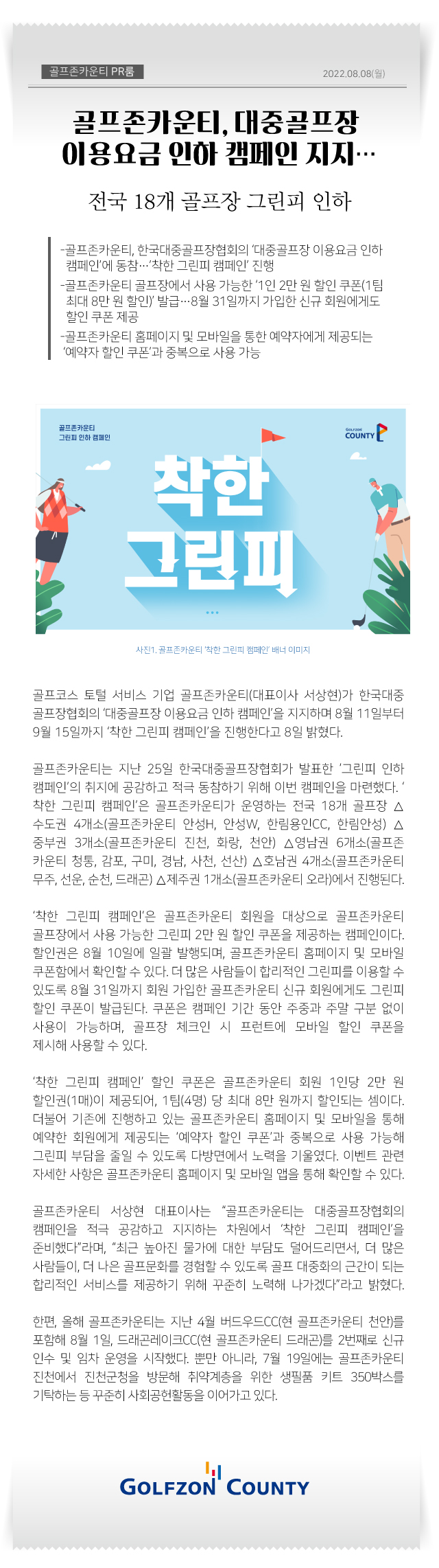 [8월8일]골프존카운티, 대중골프장 이용 요금 인하 캠페인 지지, 전국 18개 골프장 그린피 인하 언론 보도 | 2022.08.08 1 SBS 골프존카운티, 전국 18개골프장 그린피 인하 2 MTN 골프존카운티, 전국 18개 골프장 그린피 인하 3 한국경제TV 골프존카운티 그린피 인하 캠페인 동참2만원 쿠폰 발급 4 서울경제 골프존카운티, 대중골프장 이용요금 인하 캠페인 동참 5 레저신문 ‘대중골프장 이용요금 인하 캠페인’ 통했나…. 그린피 인하하는 골프장 늘어나고 있다. 6 스포츠서울 골프존카운티 그린피 인하, 대중골프장 이용요금 인하 캠페인 지지 7 뉴스1 골프존카운티, 최대 8만원 할인권 발급으로 이용객 부담 덜어 8 뉴시스 골프존카운티, ‘그린피 인하 캠페인’ 동참…쿠폰 발급 9 머니투데이 “그린피, 2만원씩 깎아 드려요” 골프존카운티, 쿠폰 뿌린다 10 이데일리 골프존카운티, 전국 18개 골프장 그린피 인하 11 헤럴드경제 “골프존카운티 운영 18개골프장, 대중골프장 요금인하 캠페인 동참” 12 FETV 골프존카운티, 대중골프장 이용요금 인하 캠페인 지지 13 국제뉴스 골프존카운티, 대중골프장 이용요금 인하 캠페인 지지 14 뉴스다이제스트 골프존카운티, 전국 18개 골프장 그린피 인하 캠페인 진행 15 뉴스인사이드 골프존카운티, 전국 18개 골프장 그린피 인하..‘그린피 인하 캠페인’ 동참 16 뉴스투데이 골프존카운티, 전국 18개 골프장 그린피 인하 17 더퍼스트 골프존카운티, ‘대중골프장 이용요금 인하 캠페인’ 지지 18 데이터솜 골프존카운티, 전국 18개 골프장 그린피 인하 19 로이슈 골프존카운티, 대중골프장 이용요금 인하 캠페인 지지…전국 18개 골프장 그린피 인하 20 리버티코리아포스트 골프존카운티, ‘대중골프장 이용요금 인하 캠페인’에 동참 21 매일일보 골프존카운티, 대중골프장 캠페인 지지… 18개 골프장 그린피 인하 22 브레이크뉴스 골프존카운티, 전국 18개 골프장 그린피 인하 23 스타뉴스 골프존카운티, 전국 18개 골프장 그린피 인하 ‘착한 그린피’ 캠페인 진행 24 시사매거진 골프존카운티, ‘대중골프장 이용요금 인하 캠페인’ 동참 25 여성소비자신문 골프존카운티 ‘대중골프장 이용요금 인하 캠페인’ 지지 26 워크투데이 골프존카운티, 대중골프장 이용요금 인하 캠페인 지지…전국 18개 골프장 그린피 인하 27 이코노미타임즈 골프존카운티, 대중골프장 이용요금 인하 캠페인 지지…전국 18개 골프장 그린피 인하 28 일요경제 골프존카운티, 전국 18개 골프장 그린피 인하 29 코리아데일리 [코리아데일리 이슈] 골프존카운티, 대중골프장 이용요금 인하 캠페인 지지…전국 18개 골프장 그린피 인하! 30 팩트뉴스 골프존카운티, ’착한 그린피 캠페인’ 진행…전국 18개 골프장 그린피 인하 31 프레스맨 골프존카운티, 그린피 2만원 할인쿠폰… ‘착한 그린피 캠페인’ 진행 32 굿모닝충청 골프존카운티, 다음 달 15일까지 그린피 1인당 2만원 할인 33 중도일보 중도일보 – 골프존카운티 “9월 15일까지 착한 그린피 캠페인 진행해요” 34 충청뉴스 골프존카운티, 대중골프장 이용요금 인하 캠페인…전국 18개 골프장 그린피 인하 35 충청신문 골프존카운티, 전국 18개 골프장 그린피 인하 본문 텍스트 복사하기 본문 이미지 전체 다운로드 연관 콘텐츠 언론 보도 [04월21일]골프존, 아파트 커뮤니티 전용 스크린골프 렌탈 서비스 론칭 2026.04.21 언론 보도 [04월17일]골프존파스텔합창단, 장애인 합창단원 모집 “함께 부르는 희망의 하모니” 2026.04.17 언론 보도 [04월15일]골프존커머스, 26년 3월 골프클럽 판매 순위 공개 2026.04.15 언론 보도 김영찬 회장, 4년 연속 ‘Golf Inc’ 선정 아시아 골프산업에서 가장 영향력 있는 인물 1위 선정 2026.04.14 언론 보도 [04월10일]골프존문화재단, 제13회 대전 그리다, 꿈꾸다 展’ 개최 2026.04.10 언론 보도 [03월31일]골프존문화재단, 1천800만원 상당 ‘이웃사랑 행복나눔’ 생필품 후원 2026.03.31