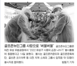 골프존뉴딘그룹, 대전 지역 연말 봉사활동 시행하며 이웃사랑 실천 -11/10(목), ‘2022 유성구 사랑의 김장 나누기’ 행사에 동참 –골프존카운티, 골프존문화재단, 골프존 조이마루 등 대전 지역 그룹사 임직원 50명 참여 –오는 12/2(금), 서울 강남구 소외계층에 김치·생필품 등 해피박스를 전달하는 ‘2022 사랑의 지역사회 봉사활동’ 진행 예정 2022.11.14