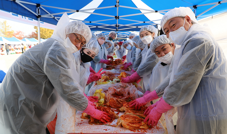 사진2. 골프존뉴딘그룹(회장 김영찬)이 11/10(목), 대전 유성구에서 시행된 ‘2022 유성구 사랑의 김장 나누기’에 동참했다. 사진은 김장 김치를 담그고 있는 그룹사 임직원들.
