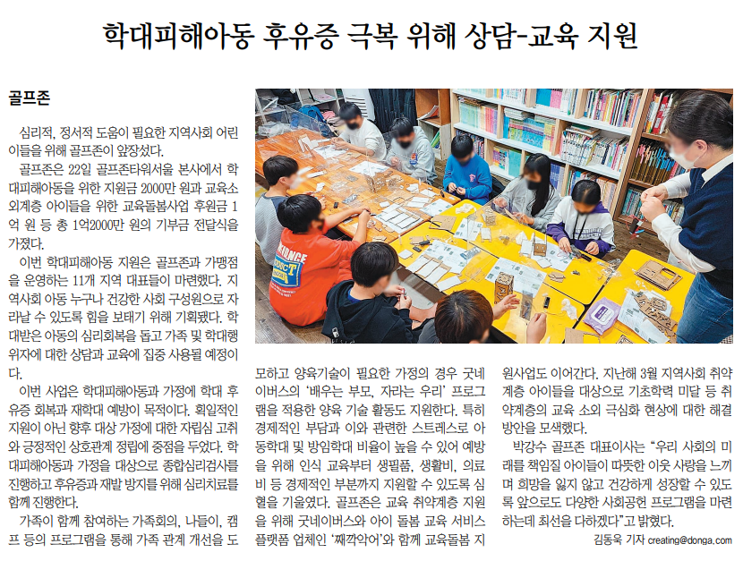 골프존이 우리사회의 미래를 책임질 어린이들에게 필요한 돌봄 활동을 지원했습니다. 골프존은 지난 22일 굿네이버스에 학대피해아동 및 교육지원 돌봄 활동을 위해