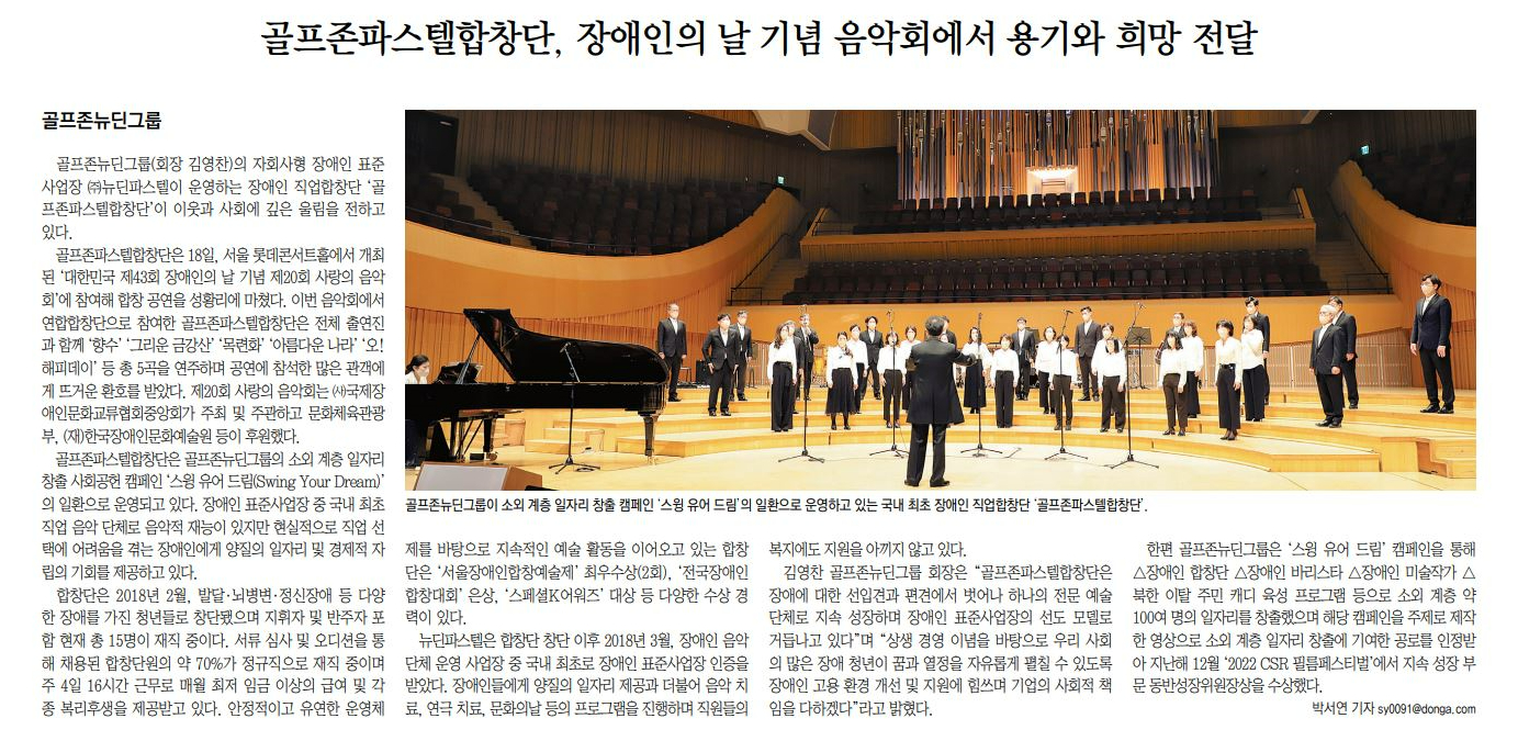골프존파스텔합창단이 장애인의 날 기념 음악회에서 연주했다는 소식과 함께 골프존뉴딘그룹 SWING YOUR DREAM 캠페인 관련 내용이 다수 언론에 보도되었습니다.