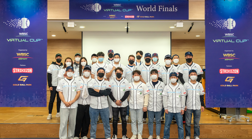 사진1. 골프존뉴딘홀딩스의 삼진홀에서 진행된 WBSC 버추얼컵(WBSC Virtual Cup)의 ‘월드 파이널(World Finals)’시상식에서 대회에 참가한 선수들이 단체 기념사진을 촬영하고 있다.