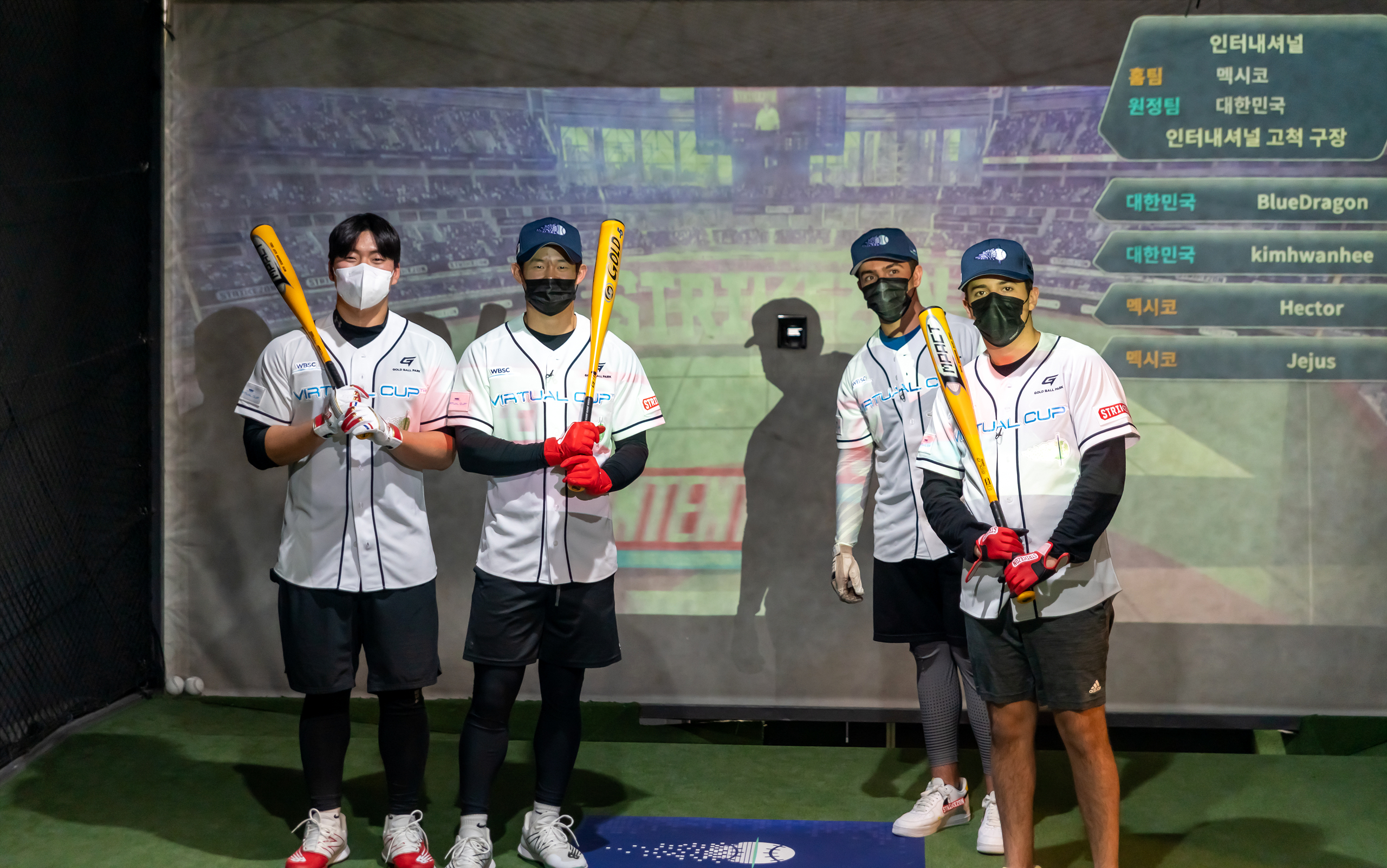 사진2. WBSC 버추얼컵에서 최종 우승을 차지한 한국 kimhwanhee팀이 멕시코 타코스 알 파스토르팀과 기념사진을 촬영하고 있다. (왼쪽부터)김환희, 김청용, Munoz, Garza 선수.